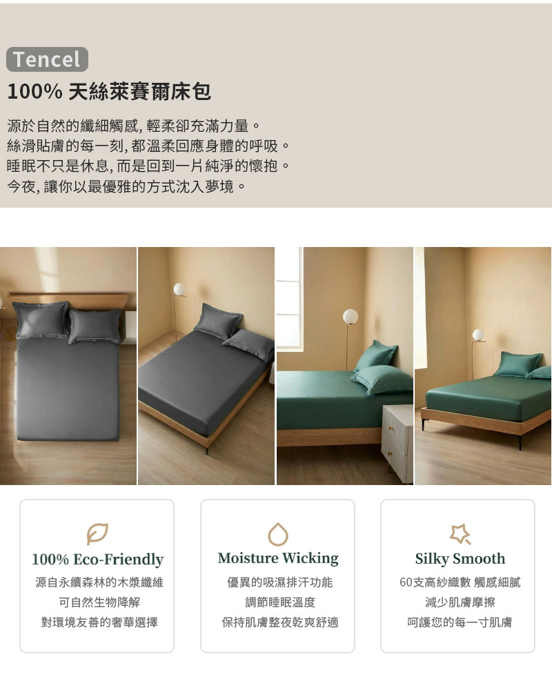 採用 100% 天絲 (60支 萊賽爾纖維),親膚柔滑透氣