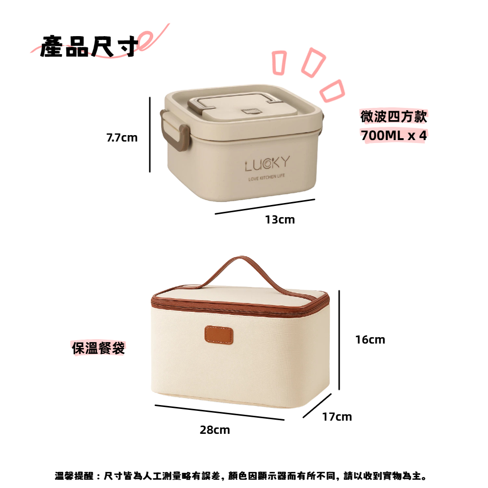 1. 此商品下單規格為微波四方款四入組組合,內容物含可微波飯盒x4+餐具組x1+保溫袋x1。