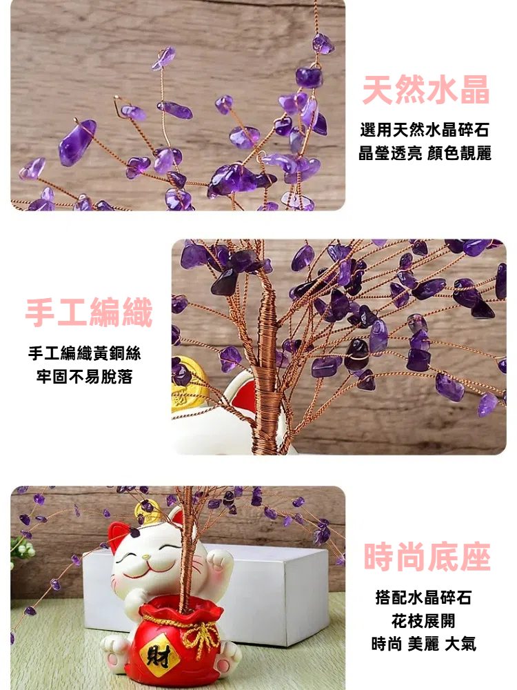 【A&R】開運水晶樹 招財貓貓福袋款款式:紫水晶尺寸:正面底約9cm、側面寬約10cm、高約28.5cm重量:約330g材質:水晶、陶瓷、銅線產地:China溫馨提醒:☆商品因手工測量方式不同,存在1-2cm誤差,請以收到實物為準。☆商品為手工製作,存在些許形狀差異及圖檔顏色因電腦螢幕設定差異會略有不同,以實際商品顏色為準,請見諒。☆產品寄出時水晶枝葉會壓歪變形屬正常情況,請客戶收到後可依個人喜好自行調整水晶枝葉的展開程度哦!謝謝您~【買家必讀】一、瞭解商品天然水晶及各種寶石都各自有其天然特徵,天然水晶一般都不如人造水晶或者玻璃通透,大部分天然水晶都有其天然特性,比如少許棉絮,冰裂和礦缺,要求比較苛刻的完美主意者請不要購買!二、商品色差尺寸寶貝都是實際商品拍攝,但是因為拍攝光線、個人顯示器色彩、不同生產批次等原因圖片與實物會稍有色差。商品的尺寸和描述的尺寸會稍有誤差,手鏈單珠之間會有微小懸殊,對尺寸沒有概念的買家請不要把我們的寶貝想像的太大或者太小,想像和實際會產生很大的偏差的。※鑑賞期並非試用期※依據消費者保護法以及民法規定,十日猶豫期間退貨屬無條件解約,並非試用期,買賣雙方依法均有保持商品完整性之義務。※退貨物須知※欲辦理退換貨請保持商品完整性(包裝、商品本體、配件等),並使用原包裝退回。若商品經拆封(含包膜)或被使用後被退回,恕不辦理退換貨程序,感謝您的配合。與肌膚有直接性接觸商品,因個人衛生考量,一經拆封恕不接受退換貨,下單前請三思!敬請您務必配合,謝謝!