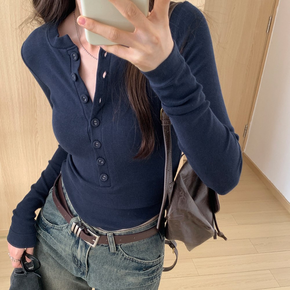 【A&R】設計感修身顯瘦螺紋鈕扣長袖T恤 深海藍,XL