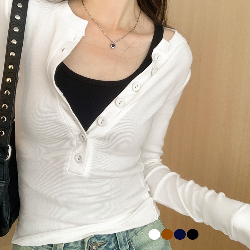 【A&R】設計感修身顯瘦螺紋鈕扣長袖T恤 潔白色,L