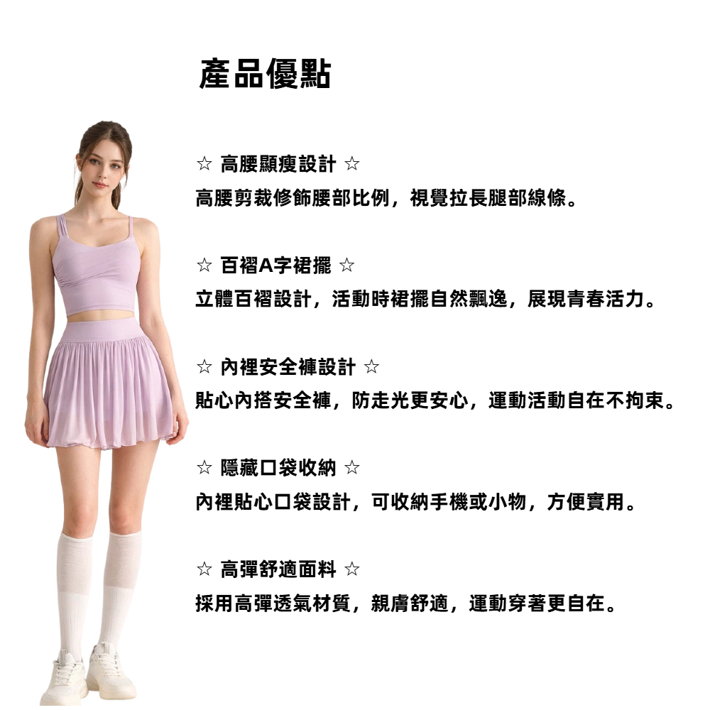 貼心內搭安全褲,防走光更安心,運動活動自在不拘束。