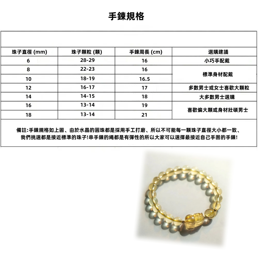 尺寸 : 黃水晶6mm、貔貅14mm、直徑60mm(彈性繩)