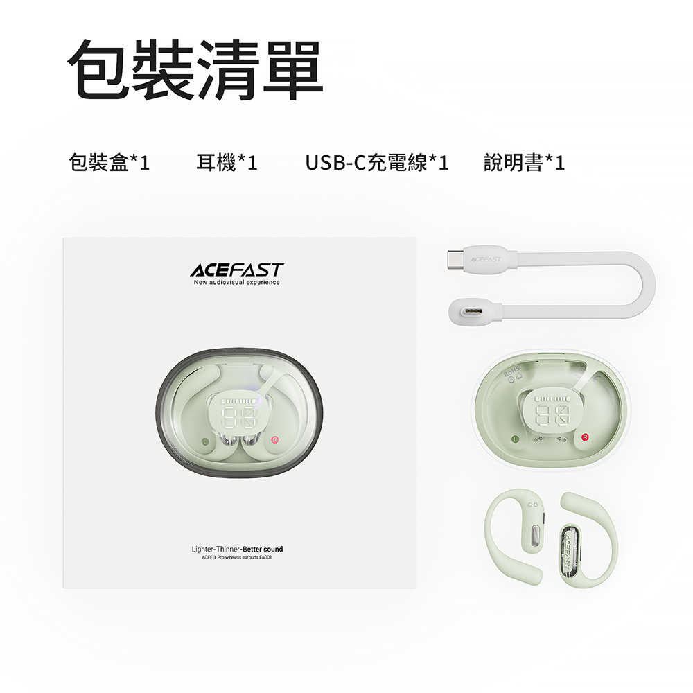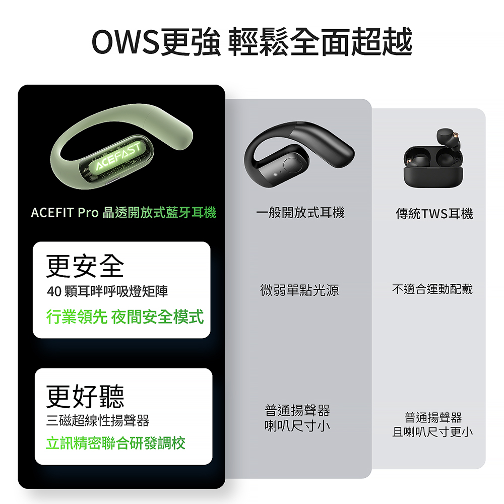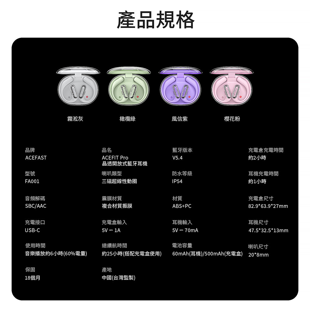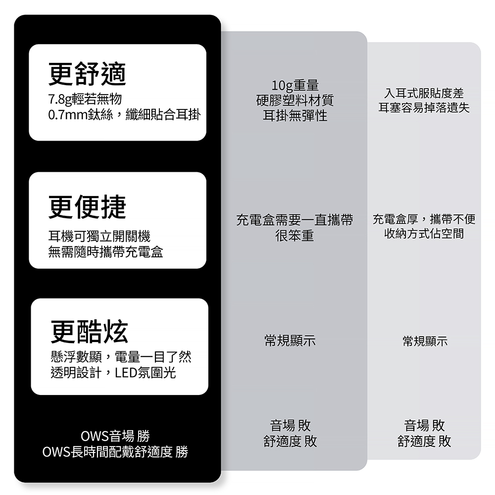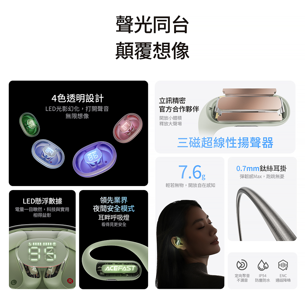 •四色晶透夜空艙,外觀專利設計•LED智能電子懸浮數顯,科技與實用兼備•新一代開放式貼耳設計,有感提升佩戴舒適感•ENC雙麥降噪,清晰對話,25HR超長續航電力•可同時連接雙設備,無縫切換•耳機可獨立開關機,無需隨時攜帶充電盒•搭載三磁超線性揚聲器,中高音清晰均衡•獨創夜間安全模式,40顆呼吸燈遠距可視•採用0.7mm航空級鈦絲,7.6g耳掛舒適零壓迫•IP54防護等級,不怕汗水雨水,有效阻塵•APP智能調控 × EQ自定義個性化音場•耳機盒27.5mm超薄不佔地,輕鬆放口袋