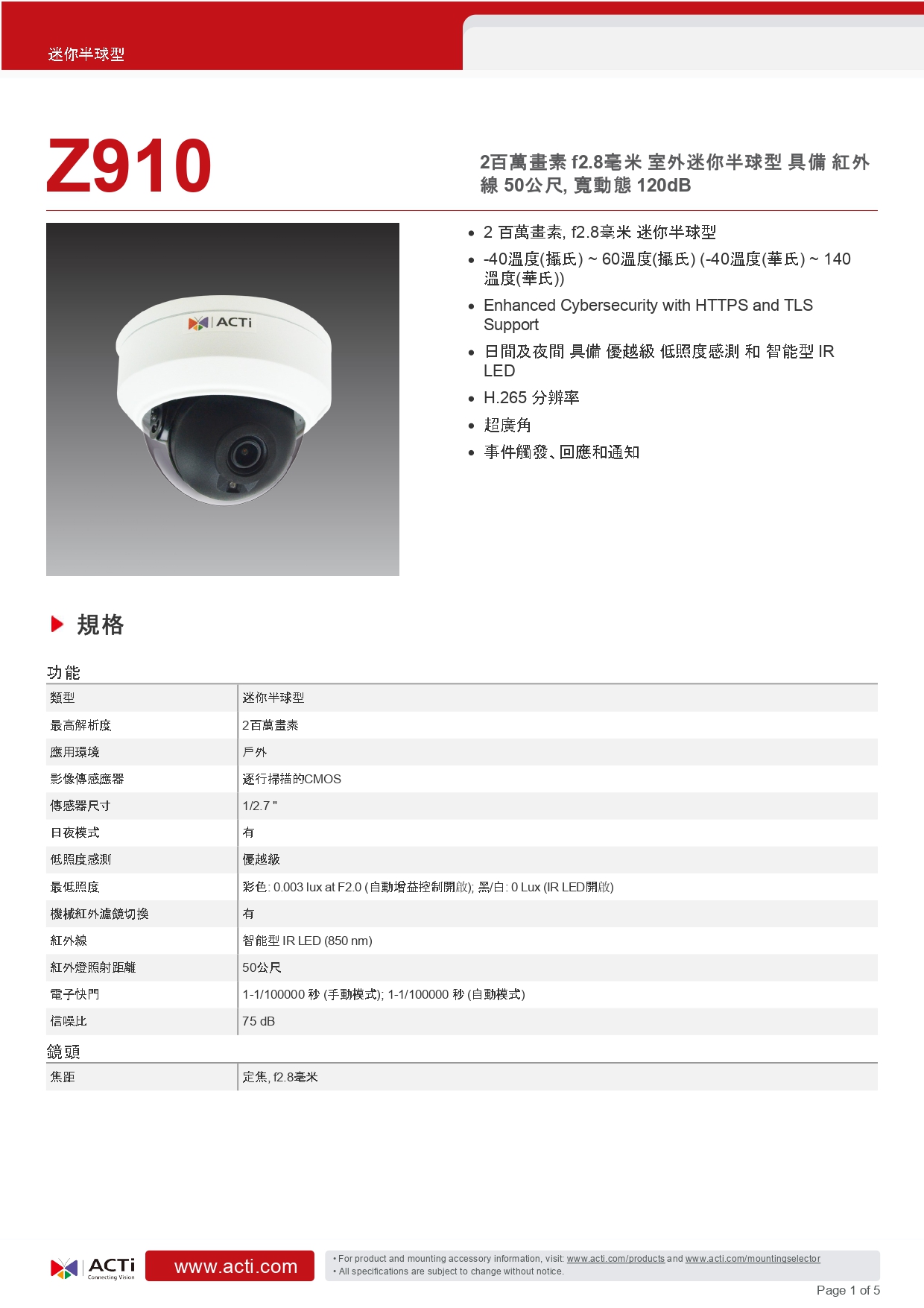 昌運監視器 ACTi Z910迷你半球型攝影機(200萬畫素)f2.8毫米 紅外線 50公尺 120 dB 防水防暴