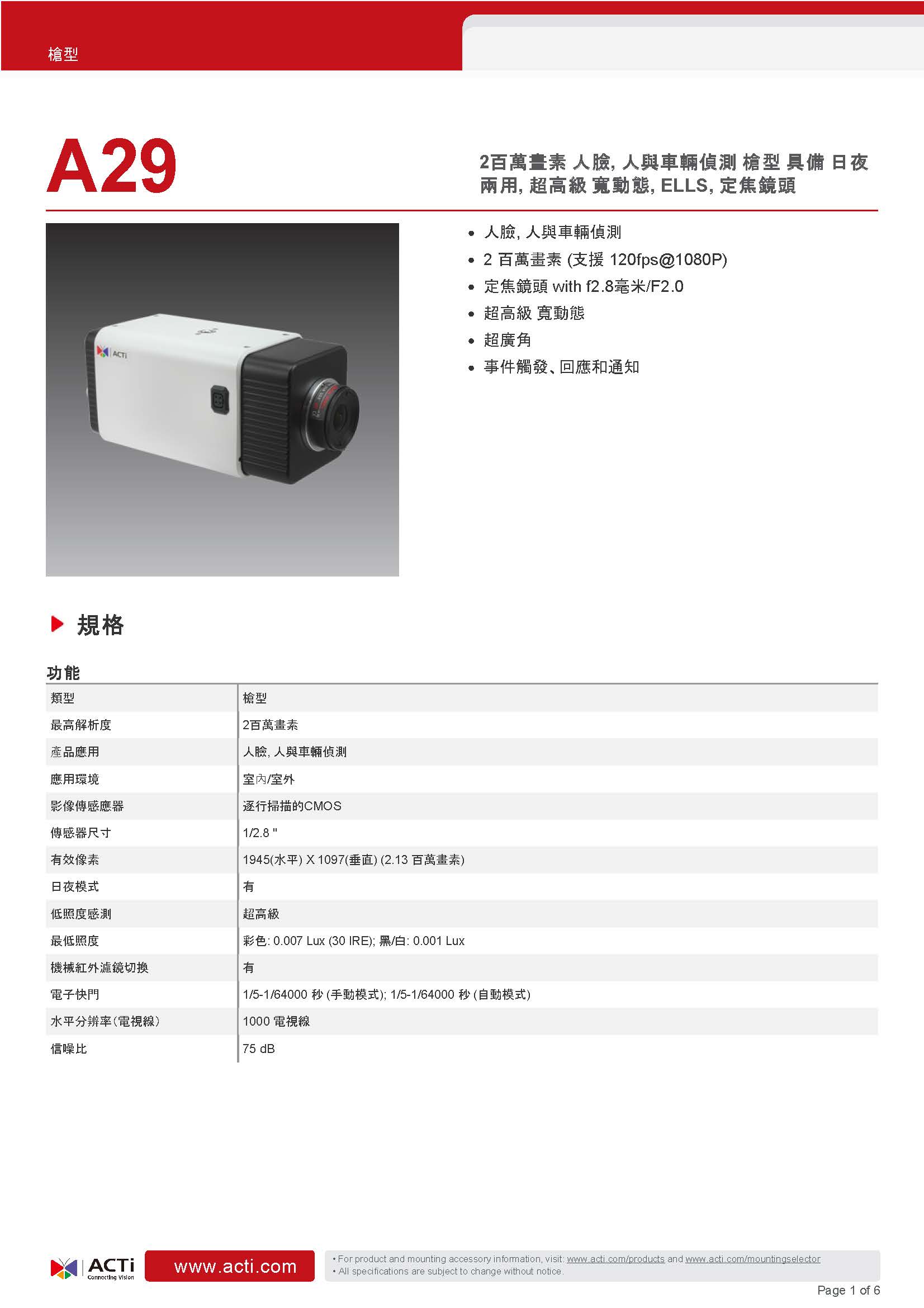 昌運監視器 ACTi A29定焦槍型攝影機(200萬畫素)f2.8毫米 150 dB POE等級3IEEE802.3af