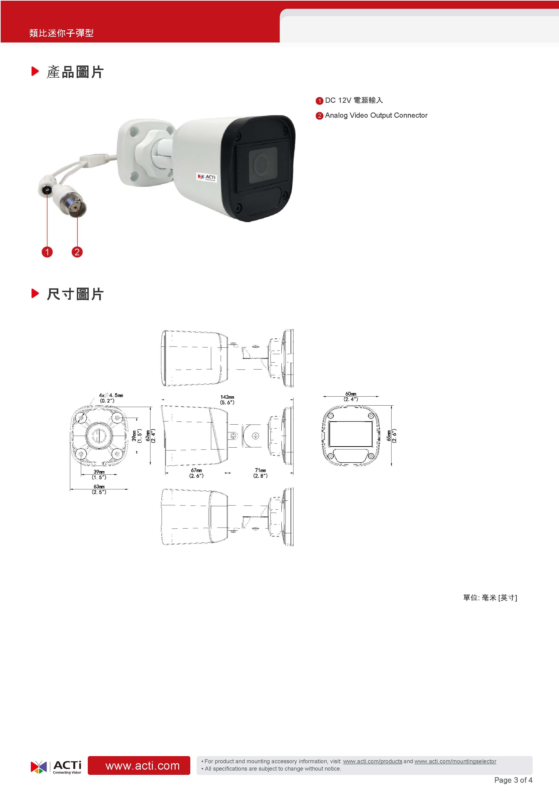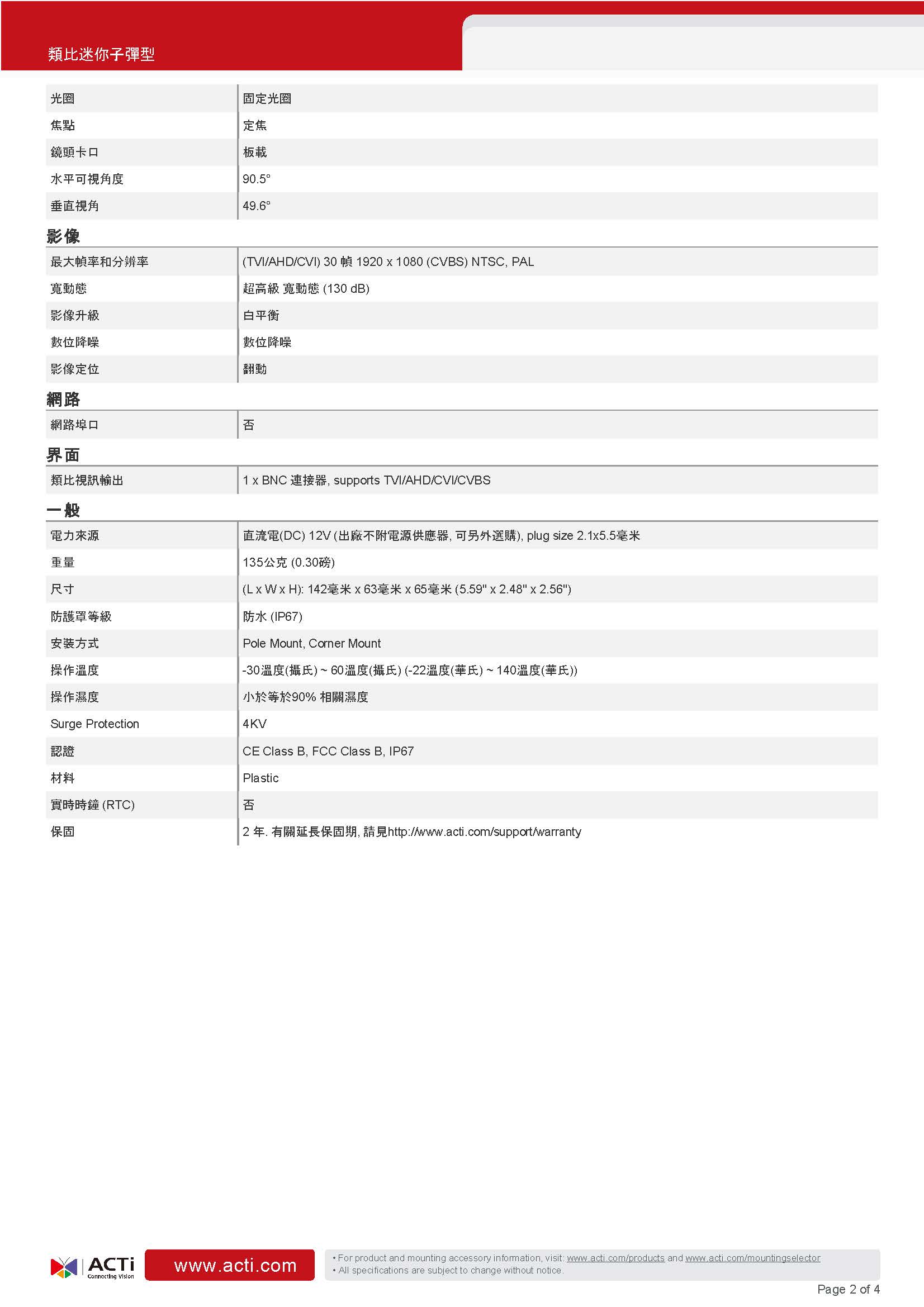 2 百萬畫素, f2.8毫米, 類比子彈型