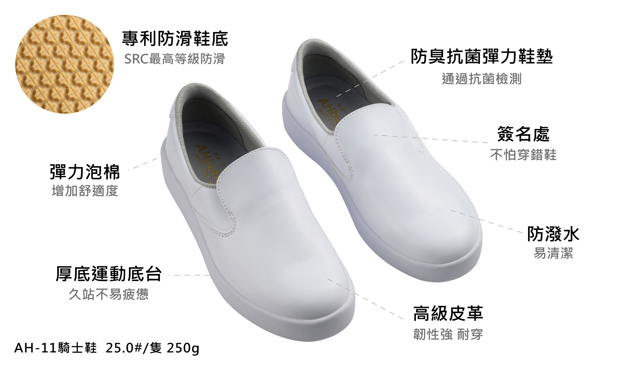 產品屬性:1.防潑水廚師鞋。2.專利防滑底花,超強抓地力。3.運動鞋底台耐久站,穿脫方便。4.耐磨、耐油、耐曲折不龜裂。保養方式:面料清潔:請棉布擦拭。底部清潔:防滑性降低時,請使用洗碗精及刷子刷洗。鞋墊清潔:將鞋墊浸泡5分鐘,稍做搓揉,擰乾晾乾。※長時間於酸、鹼環境下,會導致橡膠粘著部開膠,遇酸鹼藥劑時請以清水沖洗。※橡膠小常識:天然橡膠為保有物性不調色,每批橡膠不相同!