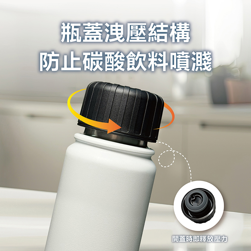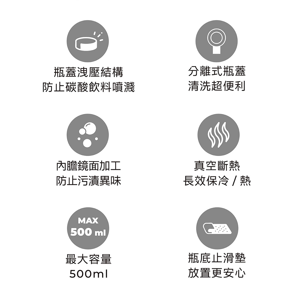 .最大容量500 ml.瓶蓋洩壓結構 , 開蓋時即釋放壓力 , 防止碳酸飲料噴出或飛濺.內膽鏡面加工 , 光滑的表面可保持氣泡並減少污漬殘留.瓶蓋分離式設計 , 矽膠皆可拆離 , 省力好清洗.真空斷熱 , 長效保溫 , 冷、熱兩用.瓶底止滑墊 , 放置更安心