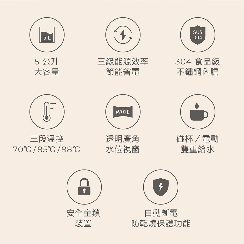 .304食品級不鏽鋼內膽.三段溫控(70℃/85℃/98℃),自由選擇水溫需求.廣角視窗,水量清晰看得見.碰杯/電動雙重給水.安全童鎖裝置,避免孩童誤用,保護家庭安全.自動斷電,防乾燒保護功能.分離式上蓋,輕鬆水洗方便晾乾