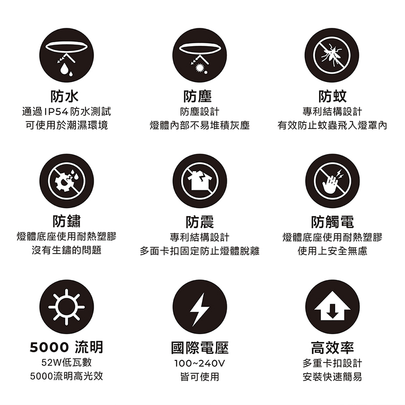 .通過IP54防水測試,可使用於潮濕環境.防塵設計,燈體內部不易堆積灰塵.專利結構設計,有效防止蚊蟲飛入燈罩內.燈體底座使用耐熱塑膠,沒有生鏽問題.專利結構設計,多面卡扣固定,防止燈體脫離.燈體底座使用耐熱塑膠,使用上安全無虞