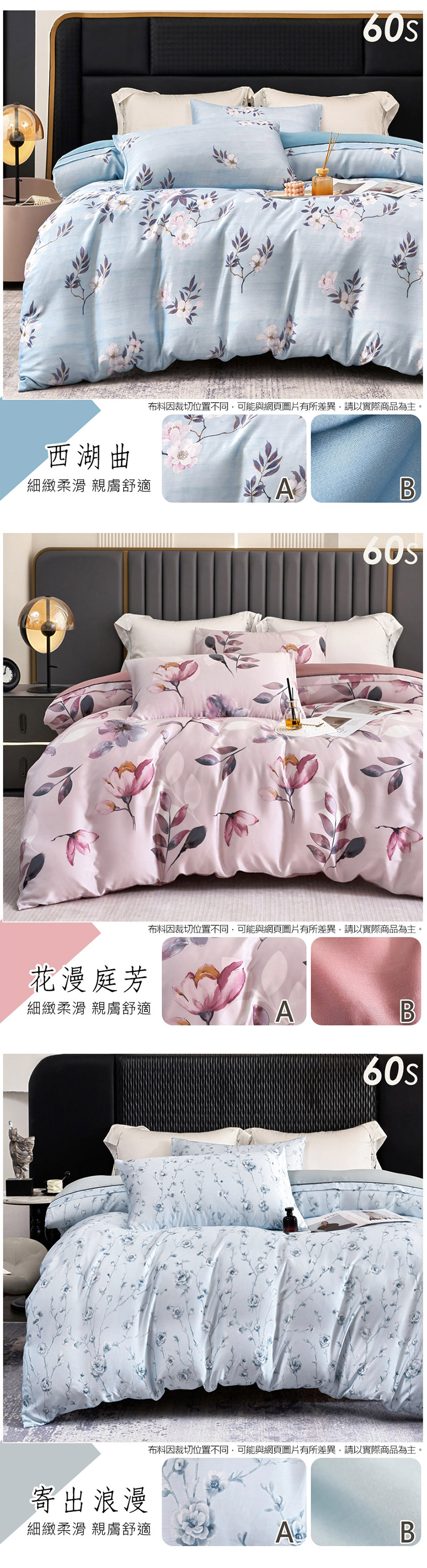 蘭精公司 100%天絲™萊賽爾纖維柔滑舒適-如真絲般的享受。選用60支(300織紗)高支高密的萊賽爾纖維布料;觸感更勝40s天絲。細緻、柔滑、高光澤度、絲般的垂墜感令人愛不釋手。原廠天絲具有優異的含水度;布料滑順細緻;讓我們接觸皮膚時;明顯感受天絲的舒爽感。頂級300織高織紗數萊賽爾天絲;採用簡潔床包枕套設計,搭配四季皆宜的兩用被。具備舒適爽涼透氣性好的絕密觸感;是您不可錯過的優值體驗。◆商品內容說明商品內容物:雙人床包x1件、美式枕套x2個、鋪棉兩用被套x1件;共四件/組。內容物尺寸:美式枕套:1.5 x 2.5 尺 ( 45 x 75 ±3 公分 )雙人床包:5 x 6.2 尺 ( 150 x 186 ±3 公分 );可包覆床高35公分鋪棉兩用被套:6 x 7 尺 ( 180 x 210 ±3 公分 ) 可裝入冬季被胎 表布材質:100% 萊賽爾纖維 (蘭精™天絲™品牌)支數60S 紗織數300織(60*60/200*100)鋪棉材-填充物100%聚酯纖維棉產地:床包、枕套:台灣製造 兩用被套:中國製造保養方式:◎商品可水洗、機洗。◎建議清洗時可放入大型洗衣袋後再清洗,同時,清洗時淺色的要與深色分開洗滌,避免顏色互染。◎勿使用漂白劑洗滌。◎可低溫熨燙。◎正常請洗程序即可。顏色:如圖,網頁產品因拍攝關係,與實品略有差異,實品顏色更佳 。產品圖僅供參考,不含拍攝道具,實際內容以包裝規格為主。※因布料裁切位置的不同,部份花版可能會與商品圖略有出入,請以收到的實品為主。◆注意事項:網路購物享有鑑賞期,非試用期,個人衛生用品,經拆封使用後恕不接受退換貨。(請於鑑賞期內確定尺寸規格無誤再使用)商品如經拆封、使用、下水、或拆解以致缺乏完整性及失去再販售價值時,恕無法退貨!