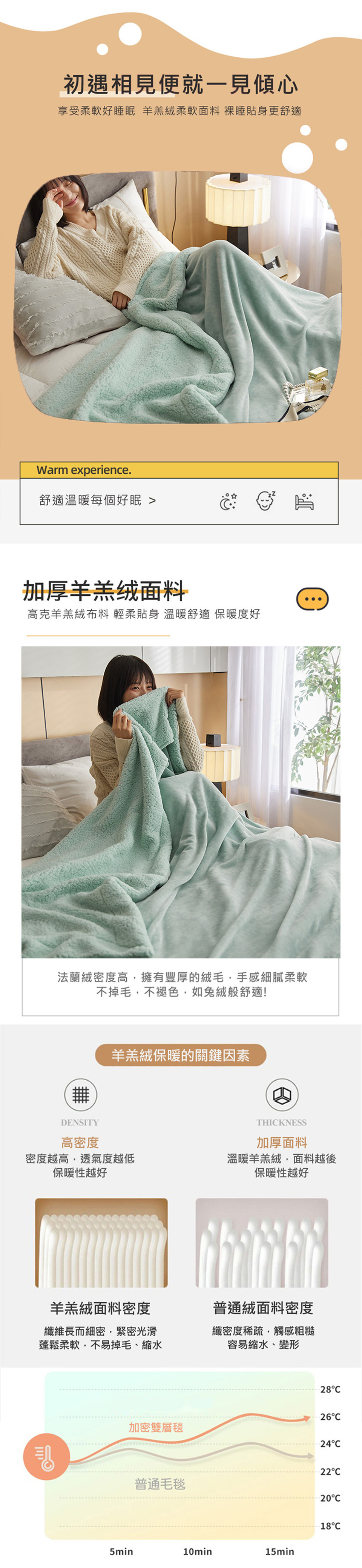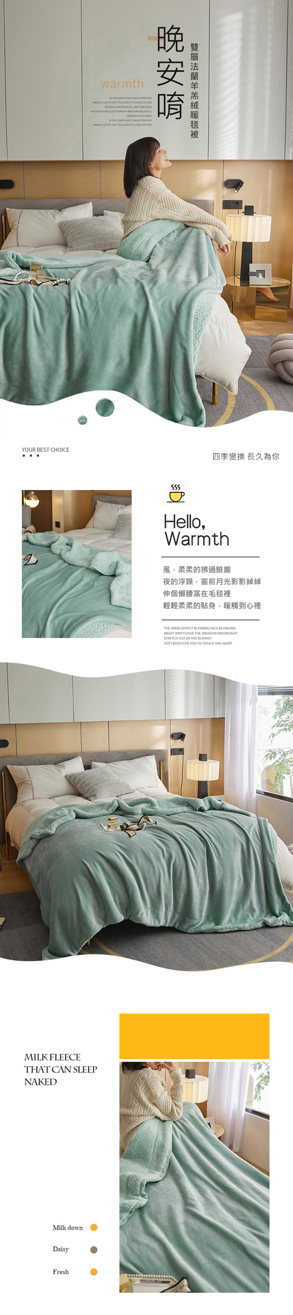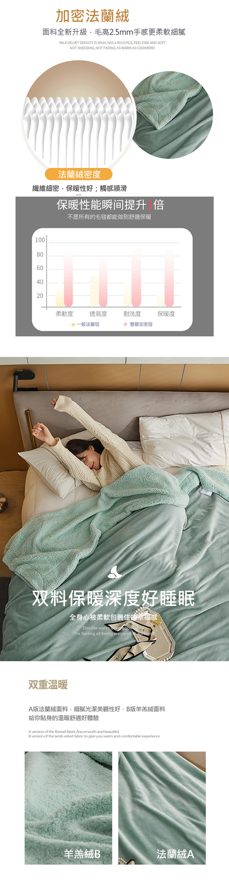 【產品特色】 享受親柔舒眠的體驗!就選法蘭絨 羊羔絨毯被!讓您無論在沙發、電腦桌前休憩或是床鋪上睡眠,都能享有即刻的保暖!簡約素雅的顏色,適合全家大小使用!舒適保暖,令人愛不釋手的聖品,冬季保暖最佳首選喔~【產品配件/尺寸】商品組合:法蘭絨 羊羔絨厚暖毯被 x 1件 尺寸:150x200cm ±5% 表面材質:法蘭絨 (100%聚酯纖維)底面材質:羊羔絨 (100%聚酯纖維)保養方式:可水洗、機洗(建議放入洗衣袋中洗滌)使用中性洗滌劑。請勿漂白。洗滌後;於暖日中曝曬。可使用低溫烘乾。 顏色:如圖,網頁產品因拍攝關係,與實品略有差異,實品顏色更佳 。產品圖僅供參考,不含拍攝道具,實際內容以包裝規格為主。※因布料裁切位置的不同,部份花版可能會與商品圖略有出入,請以收到的實品為主。◆注意事項: 網路購物享有鑑賞期,非試用期,個人衛生用品,經拆封使用後恕不接受退換貨。(請於鑑賞期內確定尺寸規格無誤再使用)商品如經拆封、使用、下水、或拆解以致缺乏完整性及失去再販售價值時,恕無法退貨!