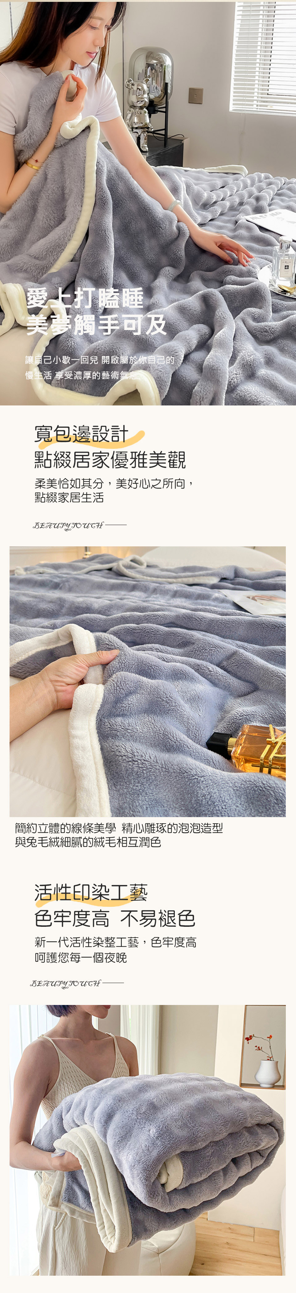 【產品特色】 享受親柔舒眠的體驗!托卡斯兔絨毯;採用泡泡壓花工藝,美觀實用,讓您無論在沙發、電腦桌前休憩或是床鋪上睡眠,都能享有即刻的保暖!簡約素雅的顏色,適合全家大小使用!親膚舒適,令人愛不釋手的聖品,冬季保暖最佳首選喔~~【產品配件/尺寸】商品組合:托斯卡泡泡兔毛絨毯 x 1件 尺寸:150x200cm ±5% 材質:托斯卡兔毛絨 (100%聚酯纖維)保養方式:可水洗、機洗(建議放入洗衣袋中洗滌)使用中性洗滌劑。請勿漂白。洗滌後;於暖日中曝曬。可使用低溫烘乾。 顏色:如圖,網頁產品因拍攝關係,與實品略有差異,實品顏色更佳 。產品圖僅供參考,不含拍攝道具,實際內容以包裝規格為主。※因布料裁切位置的不同,部份花版可能會與商品圖略有出入,請以收到的實品為主。◆注意事項: 網路購物享有鑑賞期,非試用期,個人衛生用品,經拆封使用後恕不接受退換貨。(請於鑑賞期內確定尺寸規格無誤再使用)商品如經拆封、使用、下水、或拆解以致缺乏完整性及失去再販售價值時,恕無法退貨!