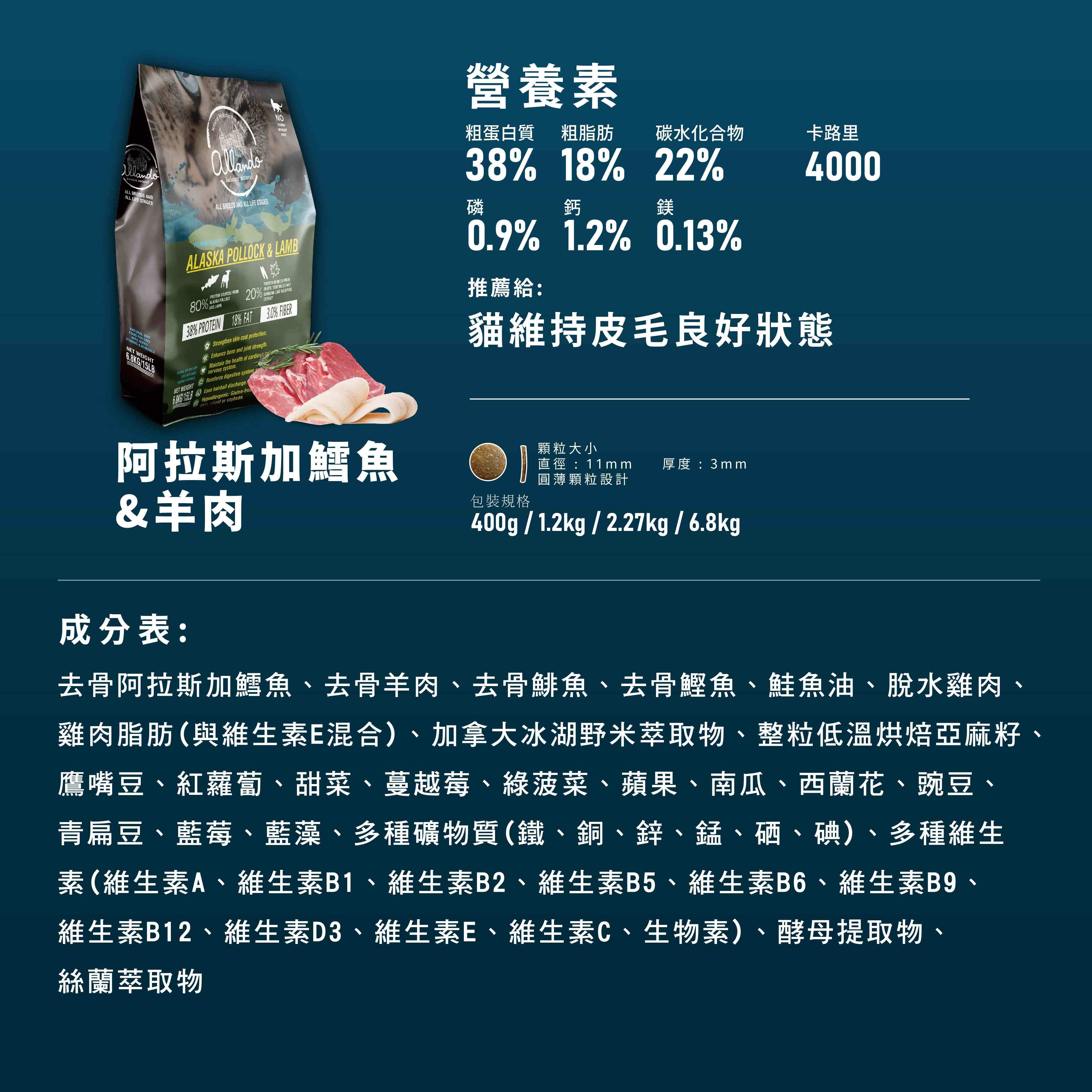 產品名稱:【Allando 奧藍多】天然全方位無穀貓糧6.8kg口味:鱈魚+羊肉規格:6.8kg產 地:台灣