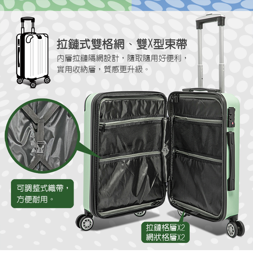 特色:掛包扣、雙內裡隔網、雙X型束帶 TSA海關鎖、鋁合金拉桿、60mm飛機輪、加大15-30%