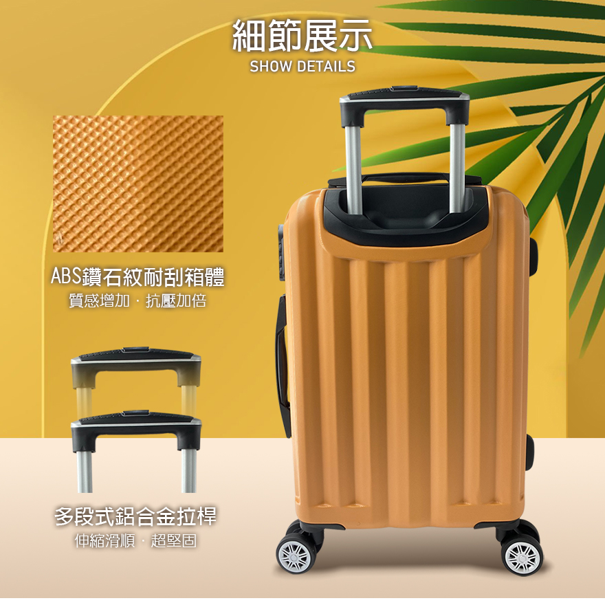 特色:三碼鎖、內裡隔網、雙X型束帶、鋁合金拉桿、立體耐磨側腳座、質感防滑提把、360度飛機輪