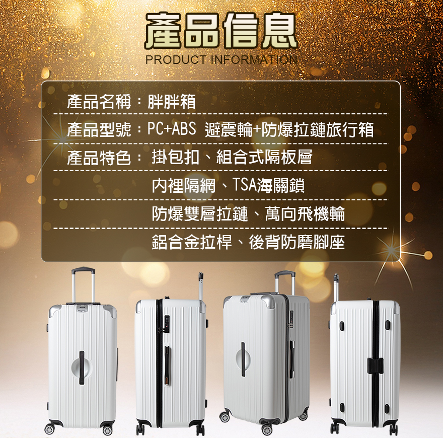掛包扣、防爆拉鏈、TSA海關鎖、內裡隔網、組合式隔板層、鋁合金拉桿、後背防磨腳座、60mm飛機輪