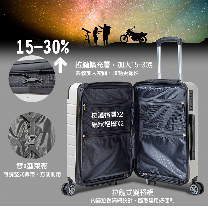 特色:隱藏式杯架、後背防磨腳座、防爆雙層拉鏈、掛包扣、TSA海關鎖、雙內裡隔網、雙X型束帶、鋁合金拉桿、隱藏式彈簧避震輪、加大15-30%