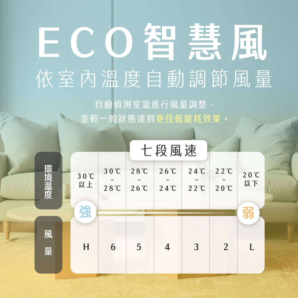 ECO智慧風模式|自動偵測室溫,調整最適風量,涼爽又節能