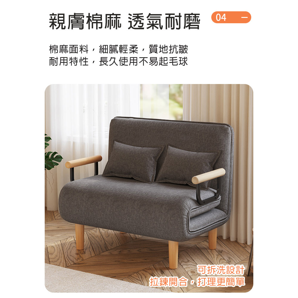 是沙發也是床自由調節不佔地棉畫材質,透氣可機洗尺寸:沙發(100*68*82cm±3%) 沙發床(100*195*28cm±3%)材質:實木腿+棉麻+海綿+鋼架