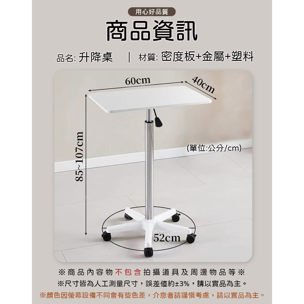 圓潤邊角 避免磕碰 升降功能 自由調節 附萬向輪 移動方便尺寸:60*40*85-107cm±3%