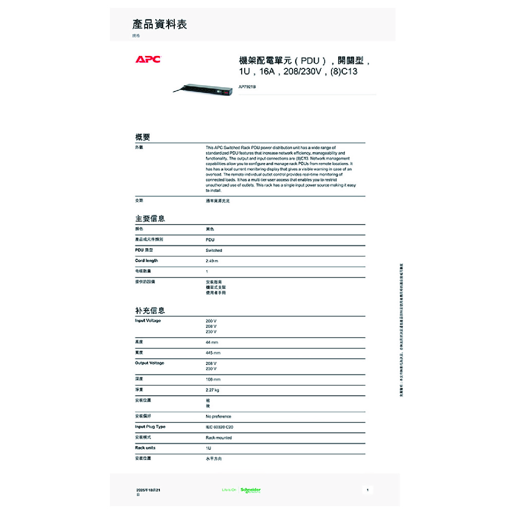 昌運監視器APC AP7921B 1U 16A 208/230V 機櫃式電源分配器 開關型