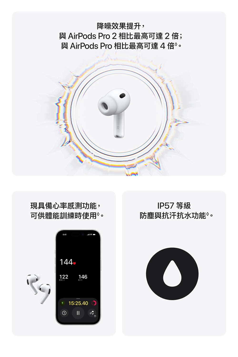 心率感測。內建心率感測功能,可測心率和消耗的卡路里 全新耳塞套 更長的電池續航力,充電一次的聆聽時間最長可達 8 小時