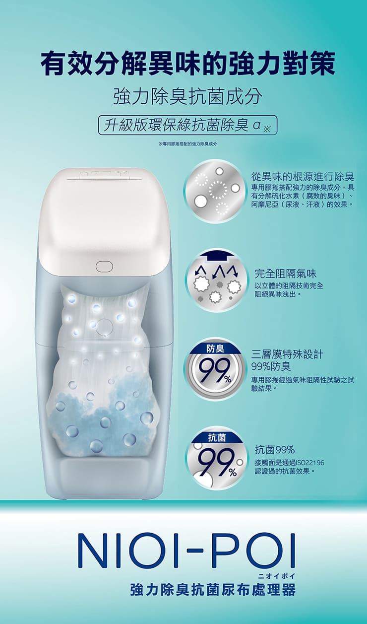 每位媽媽都希望能夠快速又乾淨地處理寶寶用過的紙尿布。NIOI-POI搭載升級版環保綠抗菌除臭α※3成分,可有效消除尿布散發的異味並達到抗菌的效果。將尿布處理器放置在寢室或客廳,也不用擔心異味或影響居家環境衛生,是讓人非常安心的產品。