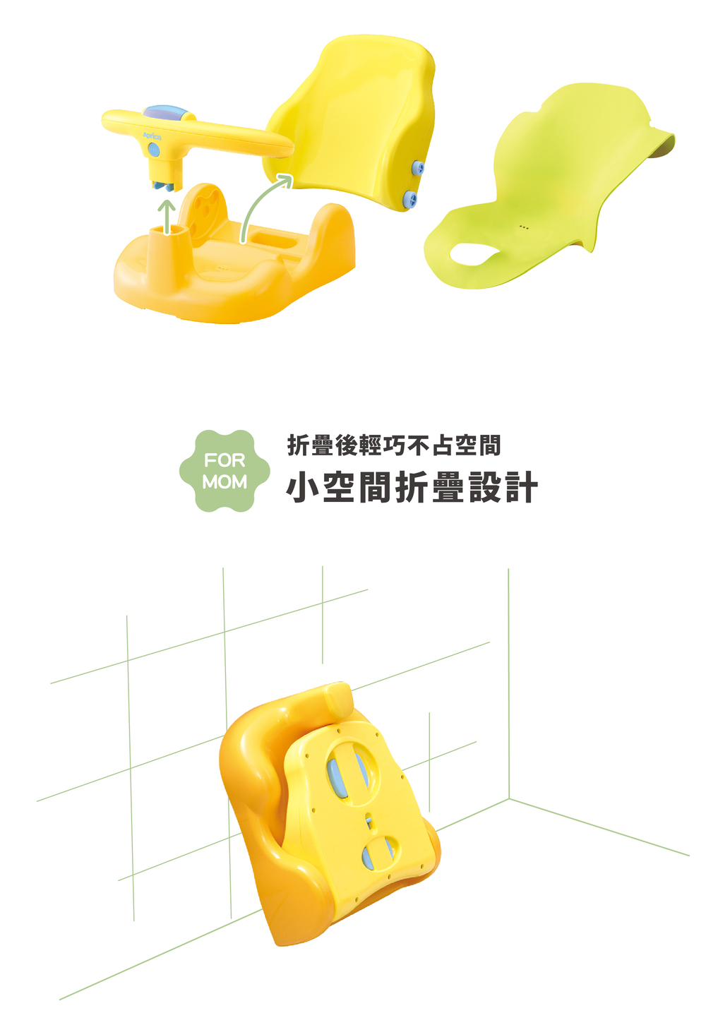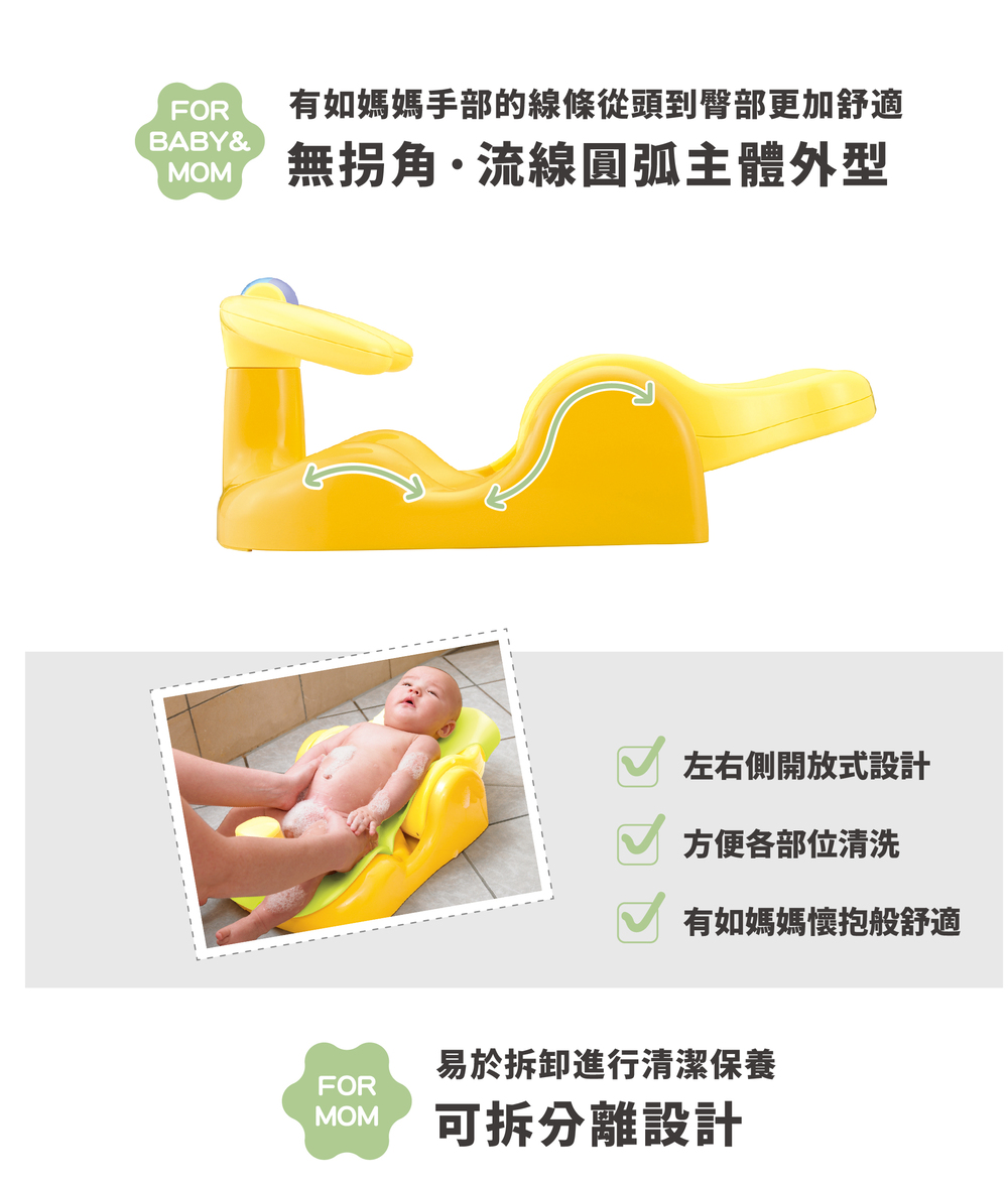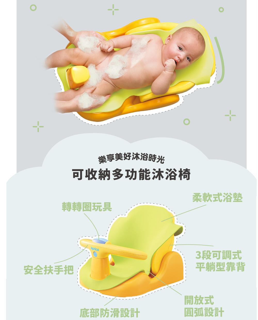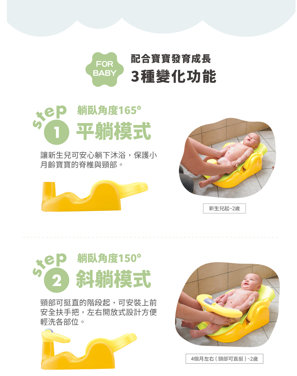 椅背具有3段可調式躺臥功能,讓寶寶從新生兒起即可安心使用。配備柔軟式浴墊與多功能的變化,讓寶寶不再討厭洗澡,增加沐浴時親子的歡樂時光。