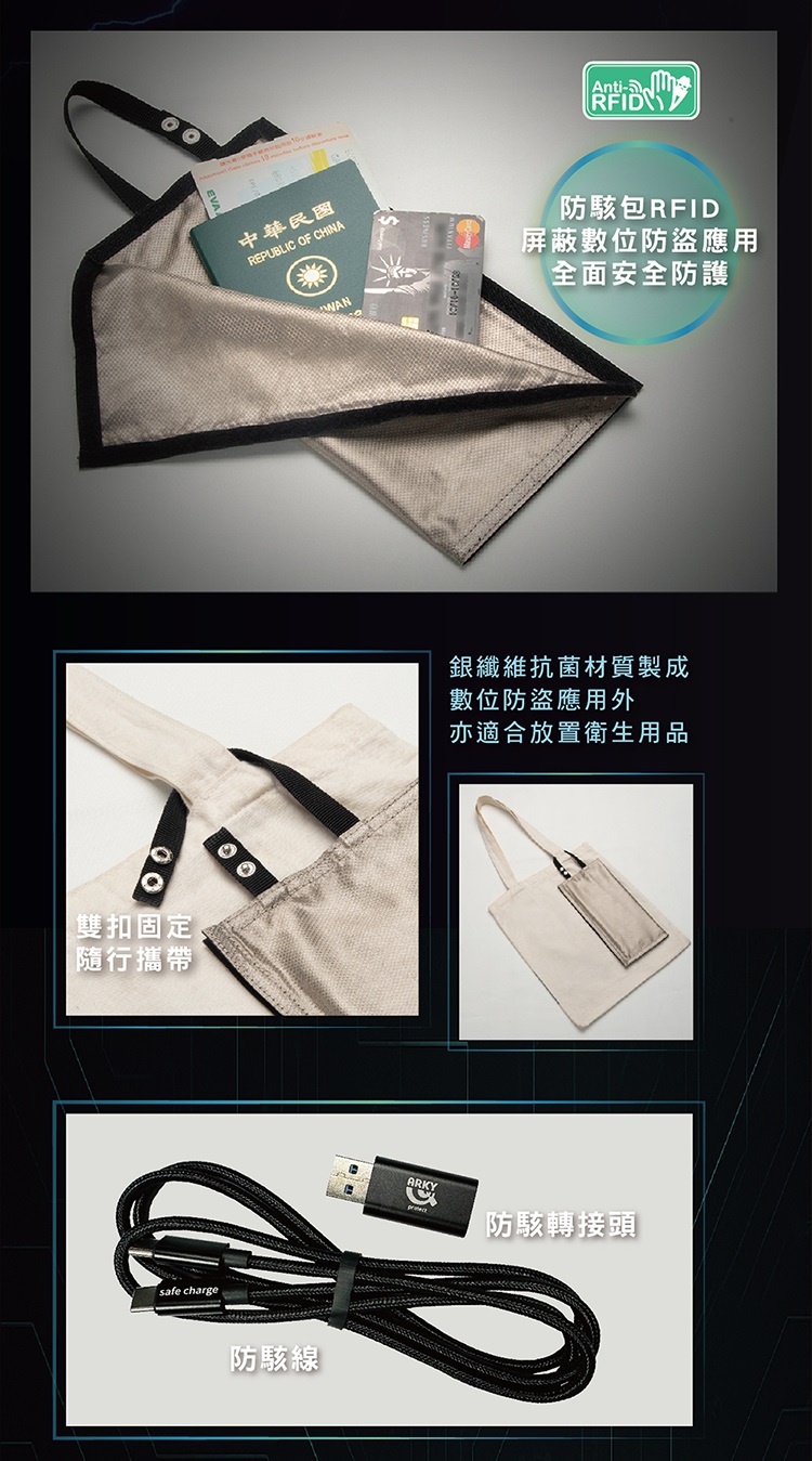 商品尺寸 :防RFID防盜收納袋25x25cm,防駭轉接頭42x17x8mm,防駭充電線120cm