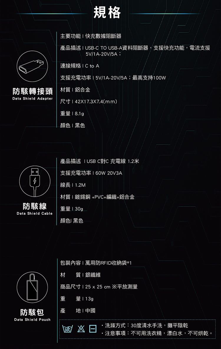 重 量 :防RFID防盜收納袋13g,防駭轉接頭8g,防駭充電線30g