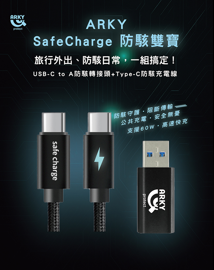 包裝內容物:USB-C to A 防駭轉接頭x1,Type-C 防駭充電線(60W快充)x1