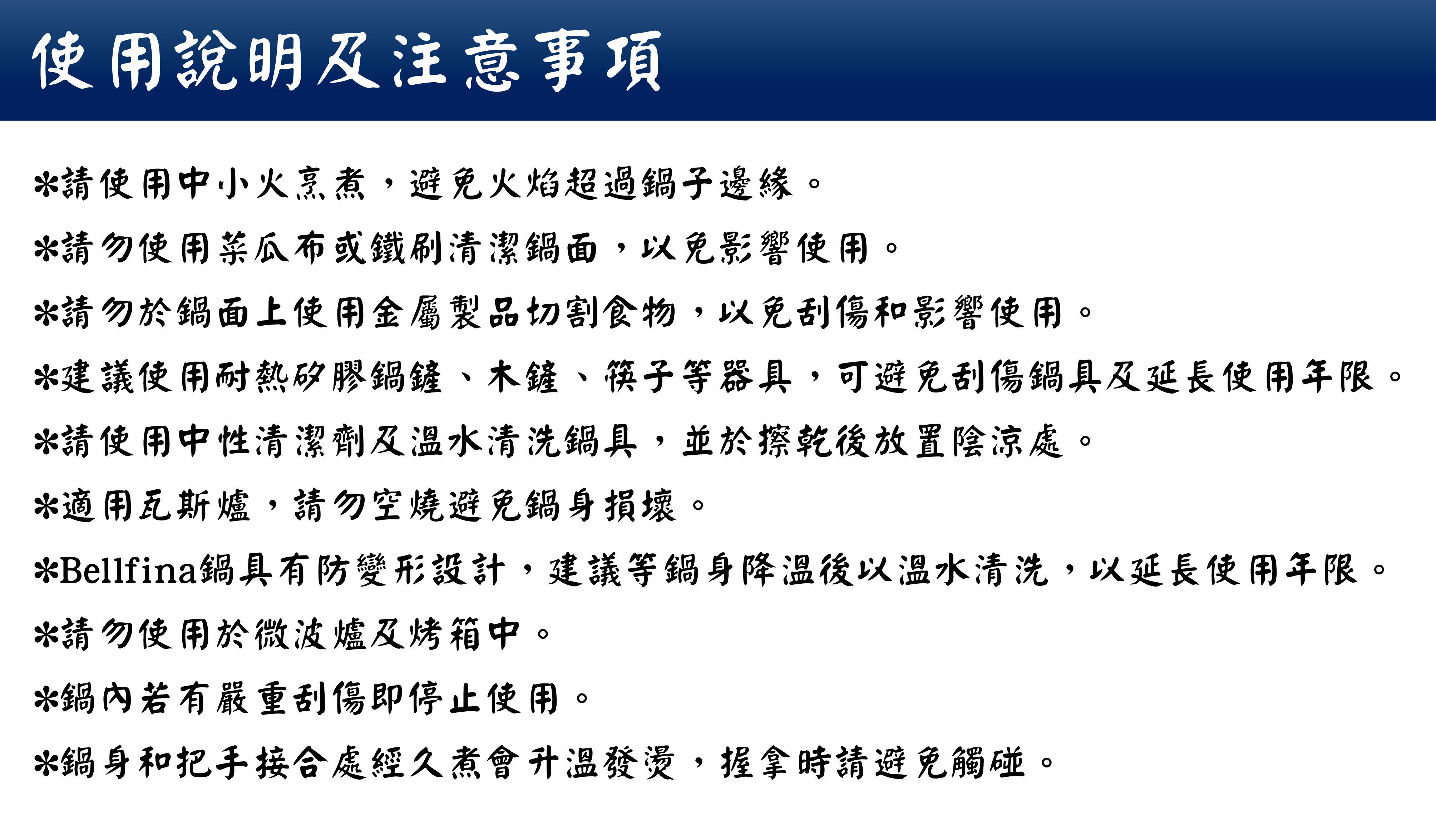 品牌:日本Arnest Bellfina產地:日本設計、韓國製造直徑:33.5cm尺寸:L52*W30*H8.5cm重量:1030g材質:鍋身-鋁合金、氟素脂不沾塗層(不含PFOA檢測通過)把手-電木及不銹鋼保固:新品瑕疵,鍋具為個人衛生用品,一經開封使用不適用七天鑑賞期規定。注意事項:使用前請確認鍋身和把手有無異狀。使用前請以中性清潔劑清洗並擦乾後使用。請勿於鍋身高溫時以冷水清洗。請使用中小火烹煮,避免火焰超過鍋子邊緣。請勿使用菜瓜布或鐵刷清潔鍋面,以免影響使用。請勿於鍋面上使用金屬製品切割食物,以免刮傷和影響使用。建議使用耐熱矽膠鍋鏟、木鏟、筷子等器具,可避免刮傷鍋具及延長使用年限。請使用中性清潔劑及溫水清洗鍋具,並於擦乾後放置陰涼處。適用瓦斯爐,請勿空燒避免鍋身損壞。Bellfina鍋具有防變形設計,建議等鍋身降溫後以溫水清洗,以延長使用年限。請勿使用於微波爐及烤箱中。鍋內若有嚴重刮傷即停止使用。鍋身把手接合處經久煮會升溫發燙,握拿時請避免觸碰。請勿置放於兒童容易觸碰觸。產地:韓國。