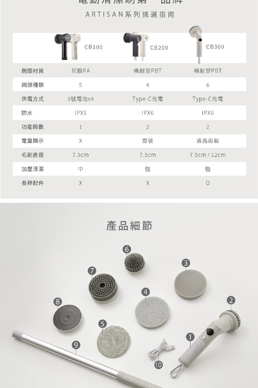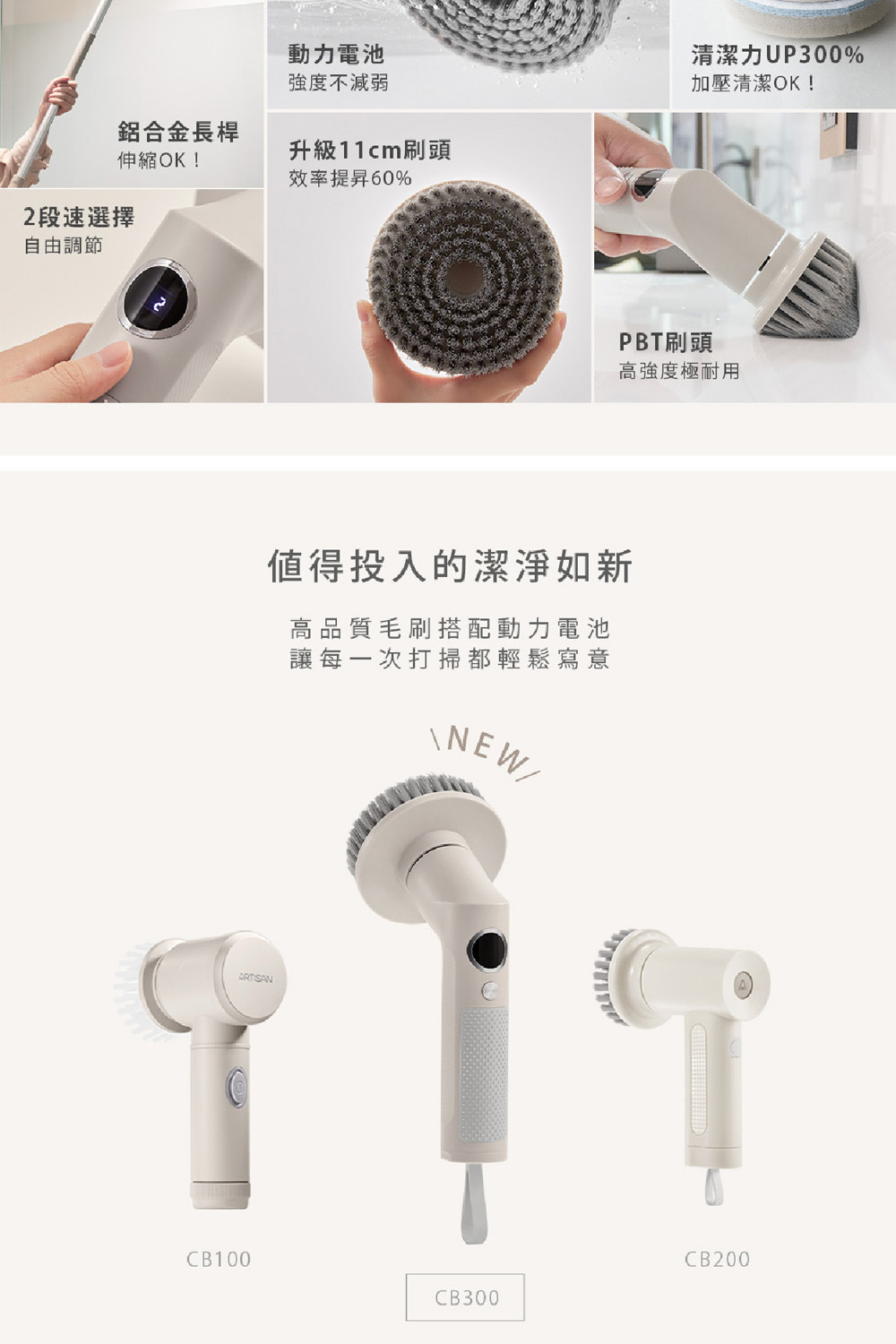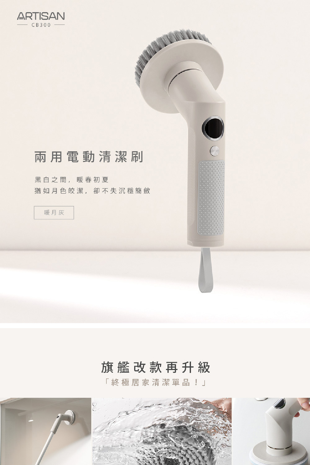 ARTISAN奧堤森 第三代USB兩用電動清潔刷 多功能 無線電動 清洗刷 清洗機 清洗高處 多刷頭 耐用 耐磨 暖月灰