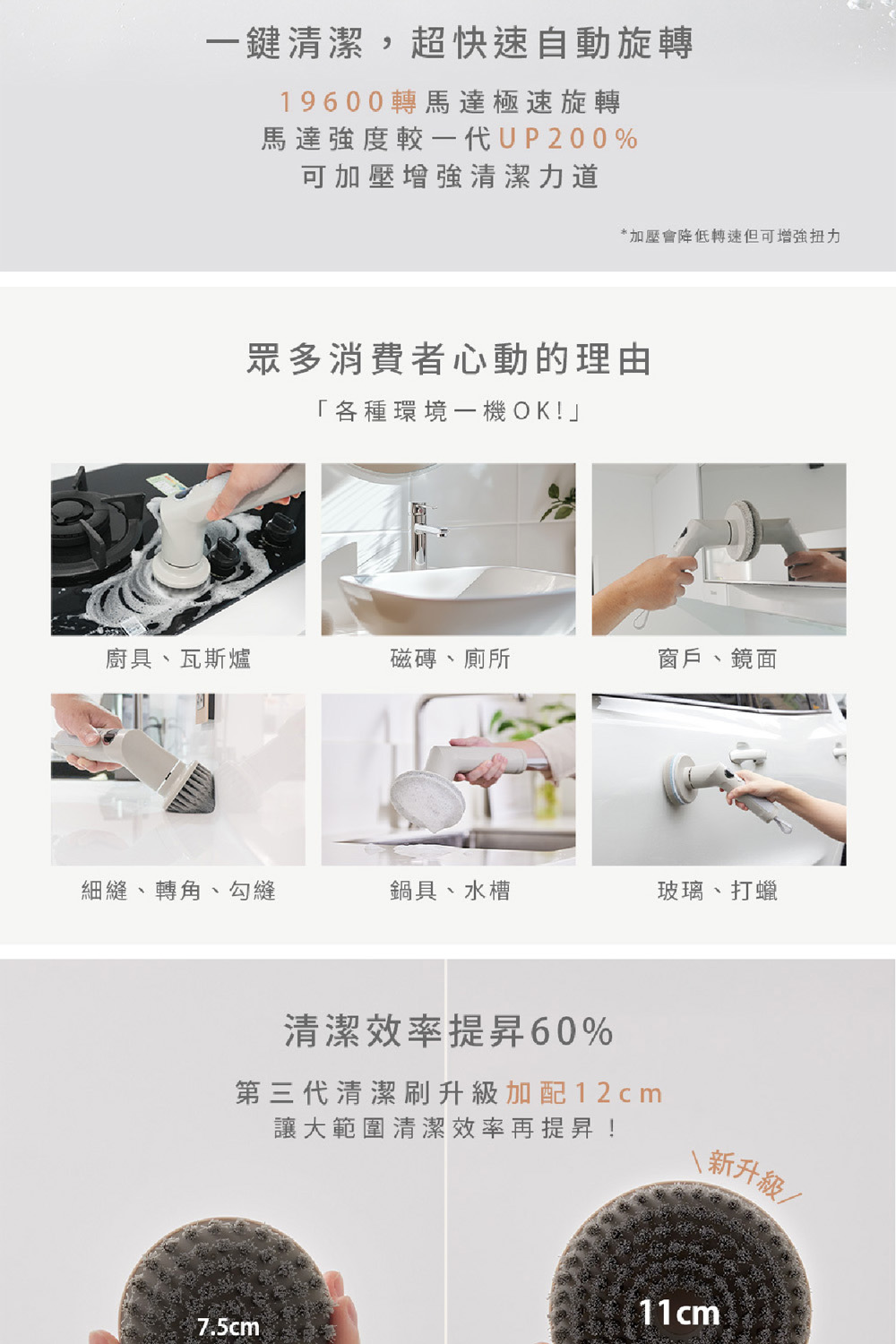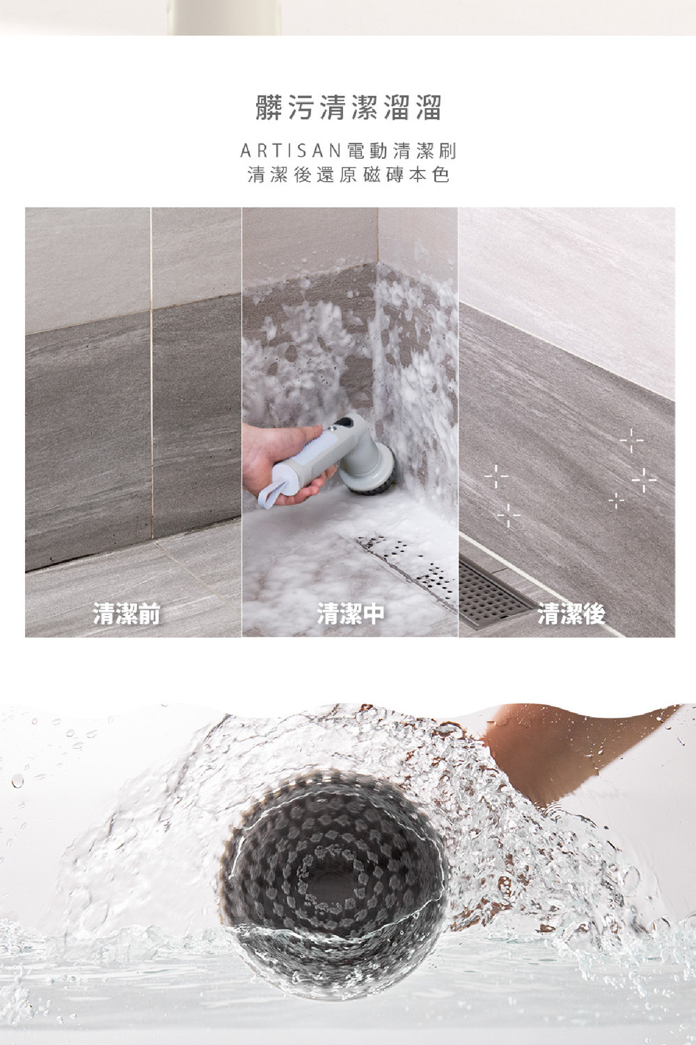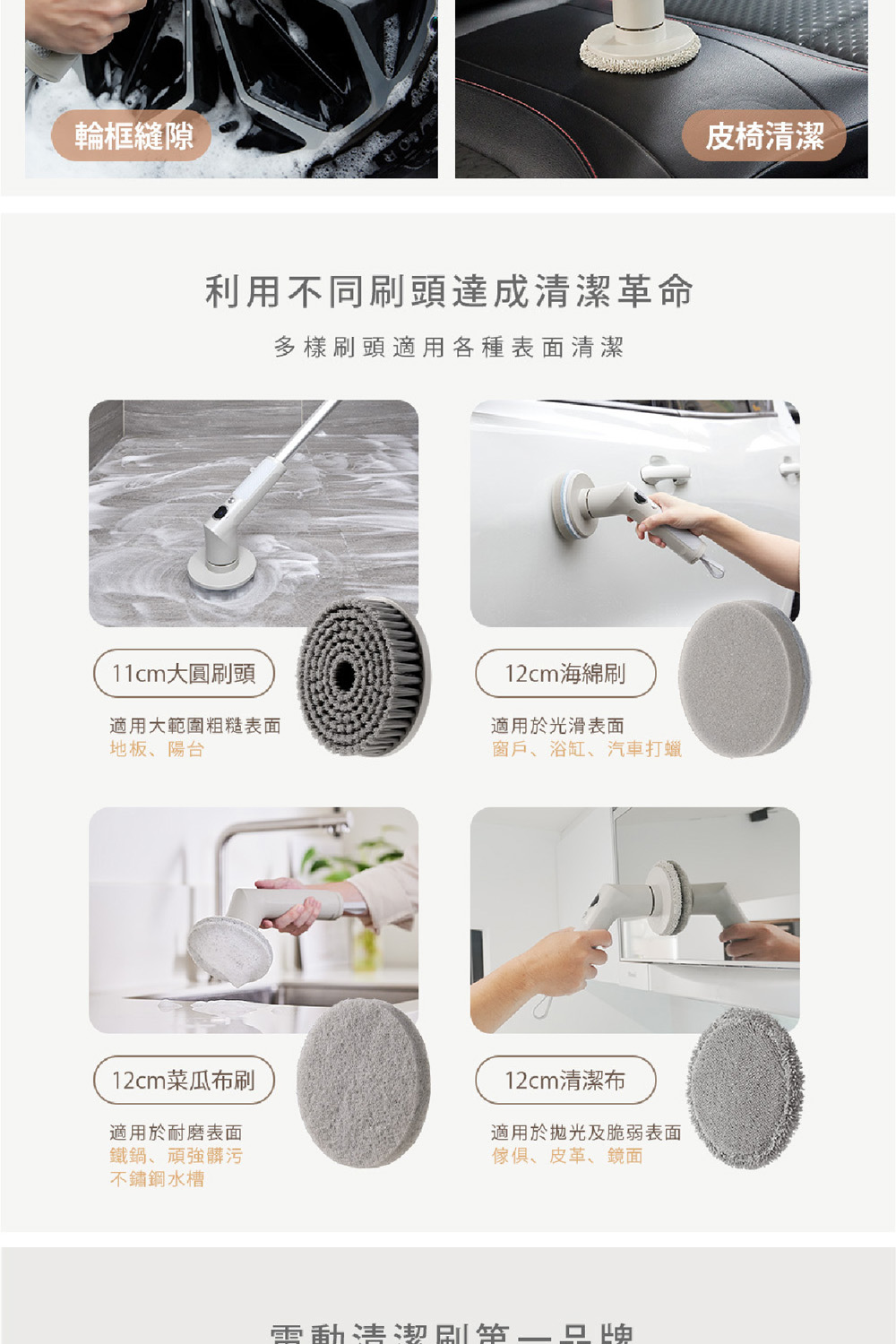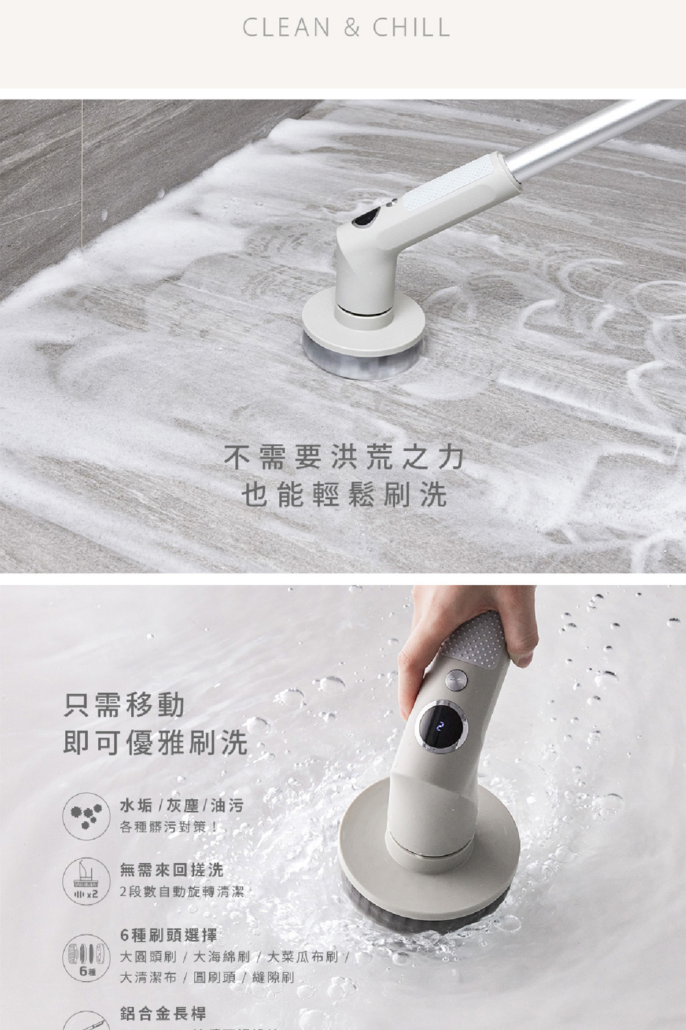 ARTISAN奧堤森 第三代USB兩用電動清潔刷 多功能 無線電動 清洗刷 清洗機 清洗高處 多刷頭 耐用 耐磨 暖月灰