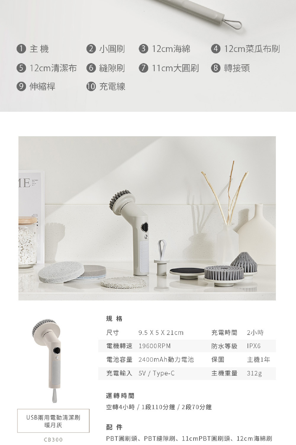 產品描述:ARTISAN奧堤森 第三代USB兩用電動清潔刷 CB300 暖月灰特色:直徑12cm毛刷,清潔效率UP六種刷頭,應對各種表面清潔19,600轉馬達,極速旋轉規格: 長寬高9.5x5x21cm,312g重產地: 台灣設計,中國製造電池容量: 2400mAh動力電池保固: 主機1年【注意事項】1.提供15天鑑賞期之權益2.退貨商品須為全新狀態且包裝完整商品,請以原始包裝方式寄回,包含完整無損之外箱、商品、包裝紙,目錄、吊牌、贈品、配件等,若原外箱已遺失,請另使用紙箱包覆於商品原廠包裝外,切勿直接於原包裝上黏貼紙張或書寫文字,來做寄送,若原盒內所有物品有損壞或遺失,須付整新費。
