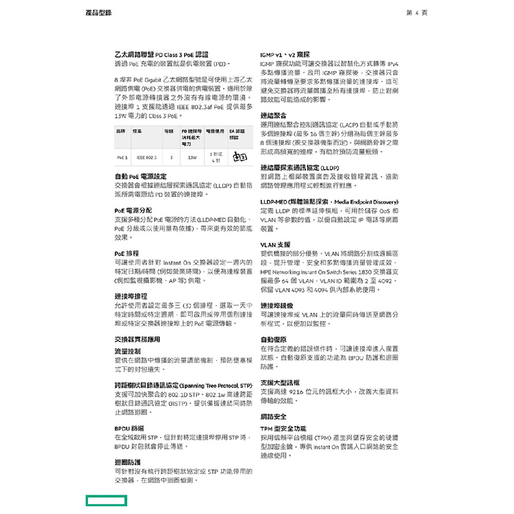 Gigabit 銅線連接埠:8;Class 4 PD (連接埠 1 到 4)