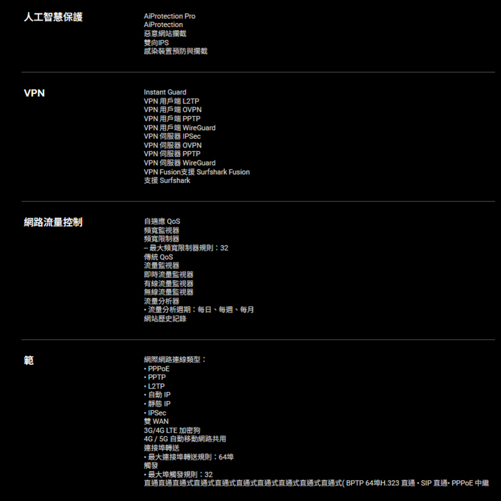 -全方位的VPN功能 : 包括先進的站對站VPN和Instant Guard行動應用程式,可透過公共WiFi進行安全的連線。