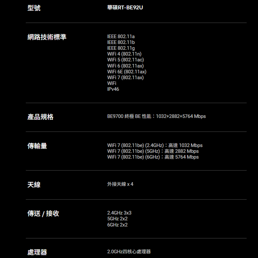 -超高速WiFi 7(802.11be) : 採用全新6 GHz頻段的320MHz通道及4096-QAM技術,顯著提升網路容量和傳輸量,最高速度可達9700 Mbps。