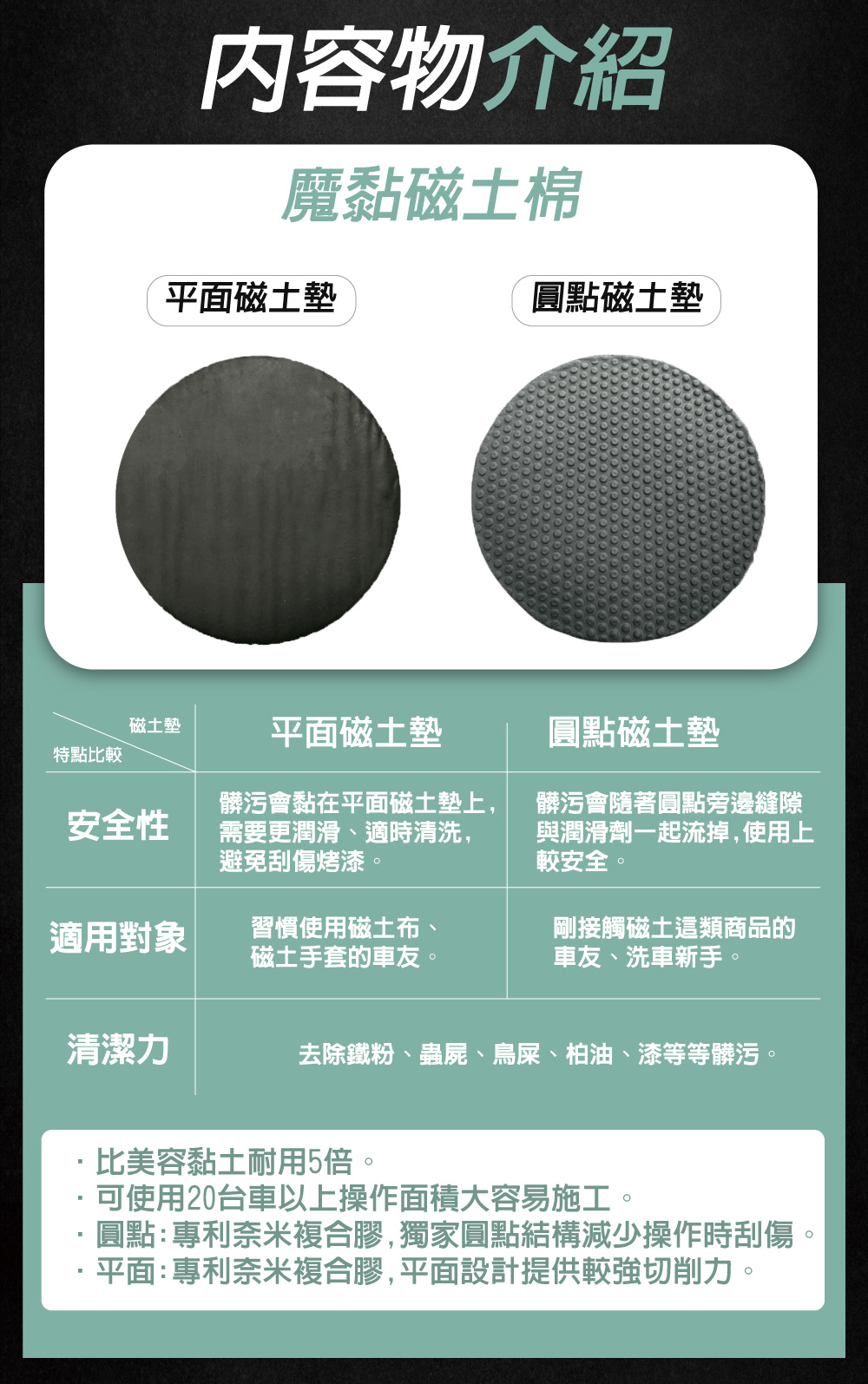 台灣專利創新研發,比美容黏土耐用5倍,最安全有效的美容黏土替代品,符合人體工學設計,高密度聚氨酯握把,輕巧好握易施工。 4吋可拆式魔鬼氈設計可重複使用,方便更換各種棉盤,讓施工變簡單,改善傳統美容黏土耗費時間和體力。 商品介紹 Magic Applicator Pad 魔の手 ‧符合人體工學設計,高密度聚氨酯握把,輕巧好握易施工。 ‧4吋可拆式魔鬼氈設計可重複使用,方便更換。 ‧搭配不同棉盤可發揮各種功能,如魔黏磁土棉、上蠟棉、砂紙。 ‧尺寸:直徑100mX高70mm ‧顏色:紅 ‧成分:高密度聚氨酯 Magic Clay Pad 魔黏磁土 ‧比美容黏土耐用5倍,最安全有效的美容黏土替代品。 ‧讓施工變簡單,改善傳統美容磁土耗費時間和體力。 ‧4吋魔黏磁土墊易拆,操作面積大,容易施工。 ‧專利奈米複合膠,獨家圓點設計更安全/平面設計提高去除力。 ‧去除鐵粉、飛漆、頑垢、蟲屍、鳥屎。 ‧建議使用20台車以上就必須拋棄。 ‧尺寸:直徑105mmX高15mm ‧顏色:紅 ‧成分:奈米複合膠、高密度聚氨酯 Car Wax Applicator Pad 上蠟棉 ‧4吋高密度發泡海棉,取蠟容易。 ‧15mm厚度最適合手動上蠟使用。 ‧魔鬼氈設計易拆,複合黏膠不脫膠。 ‧施力平整,面積大上蠟均勻。 ‧藍色材質較細、硬度柔軟,適用乳蠟。 ‧尺寸:直徑105mmX高15mm ‧顏色:藍 ‧成分:高密度聚氨酯 Polishing Sponge Pad拋光海綿 ‧4吋高密度發泡海棉,取蠟容易。 ‧15mm厚度最適合手動上蠟拋光使用。 ‧魔鬼氈設計易拆,複合黏膠不脫膠。 ‧施力平整,面積大上蠟均勻。 ‧黃色材質細、硬度適中,適用固蠟、拋光蠟。 ‧尺寸:直徑105mmX高15mm ‧顏色:黃 ‧成分:高密度聚氨酯 Magic Clay Liquid魔潔光澤潤滑劑 ‧新聚合物配方,泡沫感提升,清潔漆面潤滑度高,不易產生刮傷。 ‧烤漆光澤配方,讓烤漆清潔後,光澤感提升。 ‧清潔力增強,搭配工具能有效清除烤漆表面的鐵粉、汙垢、飛漆。 ‧烤漆保養前的大清潔,讓你的保養效果加倍。 ‧推薦搭配:魔黏の手、美容磁土、魔泥磁土布,發揮最大的清潔美容效果。 規格說明 ‧品牌:Auto Care ‧品名:魔黏の手 ‧組合內容:魔の手*1、魔黏磁土(平面)OR (圓點)*1個 ‧產地:台灣 規格說明 ‧品牌:Auto Care ‧品名:魔黏の手+魔潔光澤潤滑劑 ‧組合內容:魔の手*1、魔黏磁土*1個、魔潔光澤潤滑劑600ml*1瓶 ‧產地:台灣 使用方法 去鐵粉使用程序 1.請先將車身清洗乾淨,不需將車身水分擦乾。 2.搭配魔潔光澤潤滑劑噴於烤漆表面及磁土棉上。 3.握住魔黏,並輕輕施壓拋光漆面,避免打圓,去除髒污頑垢。 4.處理後用清水沖洗乾淨,再使用吸水布擦乾。 上蠟使用程序1.黃色拋光棉適合沾取固蠟。 1.藍色上蠟棉適合搭配乳蠟使用。 2.均勻塗抹烤漆面上。 3.再使用超細纖維布擦亮。 注意事項 ‧ 嚴禁與石油系清潔劑、溶劑類混合使用(如柏油清潔劑、鐵粉去除劑或清潔蠟)。 ‧ 嚴禁長時間置於40℃以上高溫處。‧ 避免鈑金處於高溫下施工。 ‧ 膠面嚴重污染髒污、脫膠沾污,請立即更換新品,以免刮傷車漆。 ‧ 使用後用清水沖洗魔黏磁土棉並放在陰涼乾燥的地方儲存。‧ 保存方式:室內陰涼處通風處 常見Q&A Q1.魔黏磁土棉只能使用在烤漆嗎? A1.玻璃、燈殼、外部塑件、鍍鉻飾條都能使用! 因鋁圈鐵粉比較不好處理,鋁圈建議使用鐵粉去除劑。 Q2.飛漆、柏油能去除嗎? A2.水性飛漆可以去除,若被濺到的範圍太大,建議使用塗鴨去除劑。柏油黑點 (已經固化狀態)可以去除,若是剛被噴到柏油,建議使用柏油去除劑,以免使用 魔黏の手把整片板金搞糊了。 Q3.可以去除水痕嗎? A3.剛形成的水痕水漬可以去除,若是已經形成一段時間的則無法, 需要使用Willson去污撥水光澤蠟處理。 Q4.棉與魔鬼氈之間會不會容易脫膠? A4.台灣專利奈米複合膠技術,在使用後清洗揉擰時不容易脫膠, 德國進口棉相當耐拉扯。 Q5.使用時需要注意什麼? A5.魔黏磁土棉絕對不能與鐵粉去除劑、柏油去除劑等等... 這類的石油系溶劑一起使用,否則容易溶解磁土就得汰換。 06.使用後該怎麼存放? A6.魔黏磁土棉使用後用清水沖乾淨,放在陰涼處存放即可,磁土面不要朝下。 拋光棉、打蠟棉使用後搭配除蠟劑洗乾淨,一樣放在陰涼處陰乾即可。 Q7.何時替換魔黏磁土棉? A7.1.圓點抹平2.表面破損 3.使用時膠會黏在車漆上4.使用20台車以上