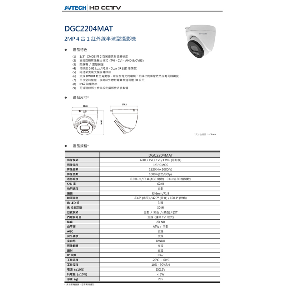 昌運監視器 AVTECH陞泰 DGC2204MAT 200萬 四合一紅外線半球型攝影機 內建麥克風