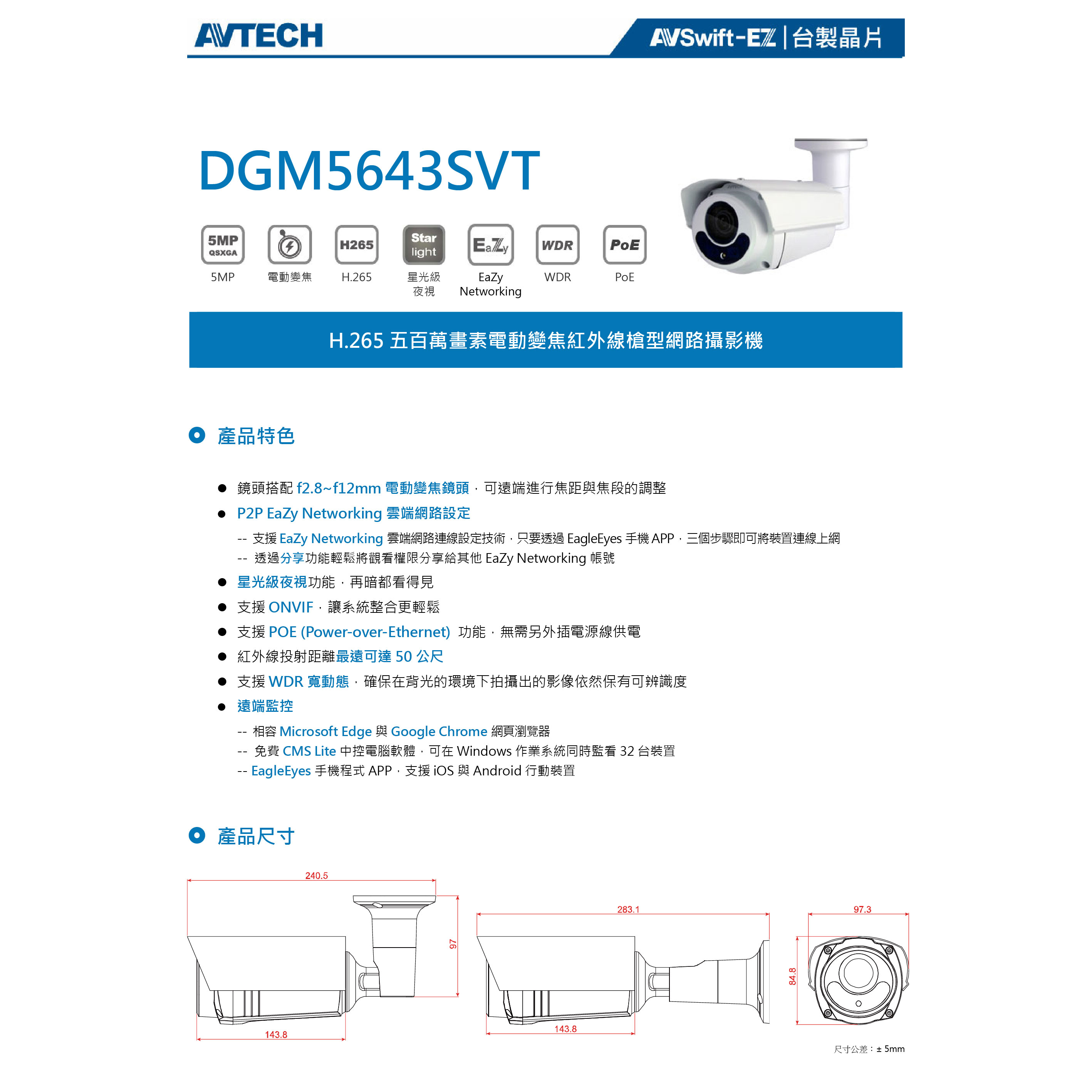 昌運監視器 AVTECH陞泰 DGM5643SVT 500萬畫素 電動變焦紅外線槍型網路攝影機 星光級夜視功能