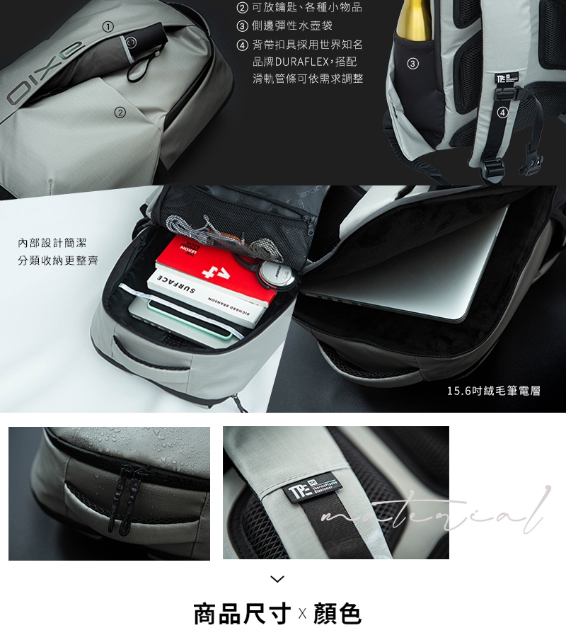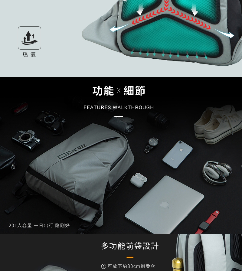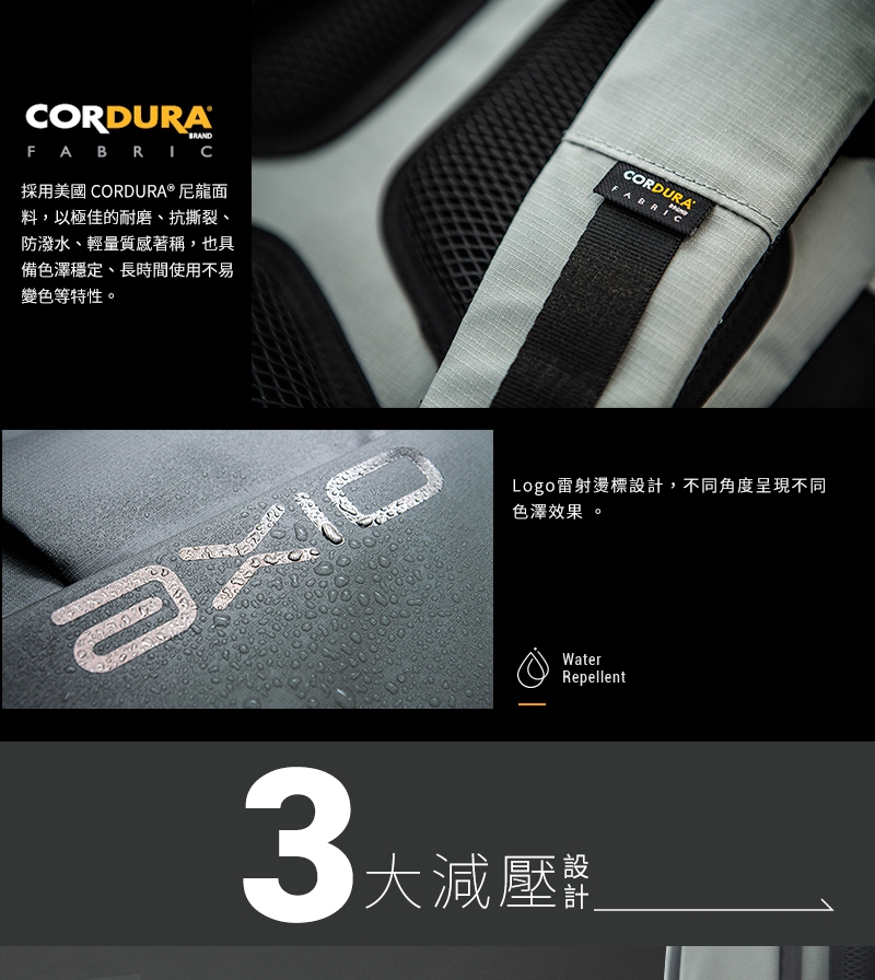 ★頂級CORDURA耐磨抗撕裂面料★獨家反重力回彈減壓技術★高科技輕克減壓背帶有效減壓50%★絲光四面彈性水壺帶★內置15.6吋絨毛筆電層★20L超大容量★背帶滑軌可調式胸扣★高透氣背部導流區★配置防潑水拉鍊