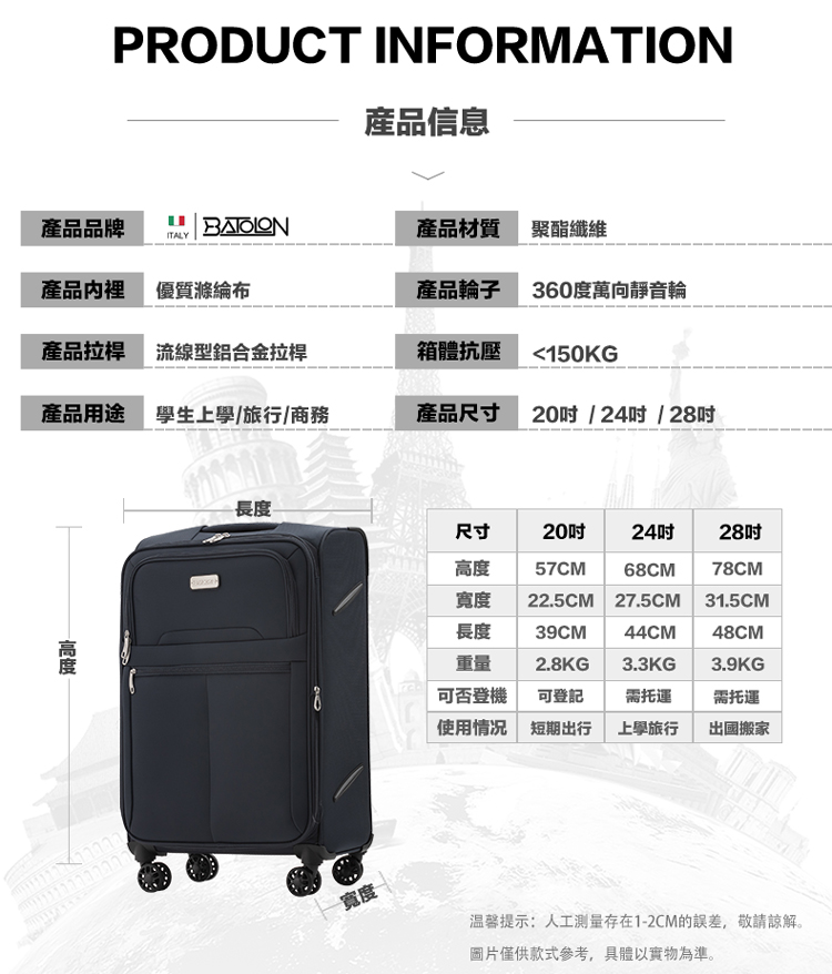 ◆尺寸(長*厚*高,含輪高):20吋/約39*22.5*57cm、24吋/約44*27.5*68cm、28吋/約48*31.5*78cm