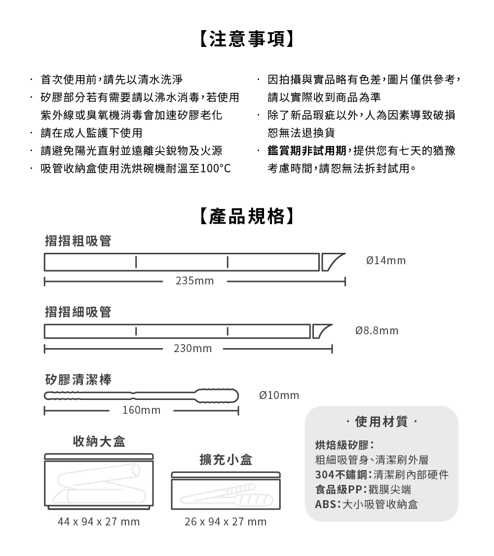 摺摺吸管特點:【一壓就入盒,俐落有型】目前不少吸管往往需要雙手並用,轉開、拆解後再凹折才能收納,有時手上已經沒有多餘的空間可以處理,只能放下手邊其他事物慢慢地雙手並用把吸管收納回去;摺摺吸管考慮到這點,將管身外壁特別加入了腰身設計,讓三折式吸管能夠自動凹折,俐落收納入盒,省去拆解扭轉的麻煩,使雙手不用觸碰到沾有飲品的黏膩管身,步驟簡單孩童使用也不怕搞混。【滑蓋開法輕鬆取】只需用拇指輕滑開吸管自動翹起,利用矽膠材質的彈性讓三折吸管自主翹起輕鬆好拿取,省去為了拿取環保吸管在小小的收納盒中左挖右摳的時間。【三折收納】管身外壁腰身設計,讓三折式摺疊更EASY!只需輕輕一壓,吸管自動凹折,解放您的雙手~乖乖落入收納盒中,省去拆解、扭轉、沾手的麻煩【好戳膜不需配件】粗細吸管好戳膜不須額外配件,向下戳膜洞口小,飲料也不再噴飛;特殊尖端鈍角設計,不擔心孩童戳膜時刺傷自己。【可替式零件好拆洗】透感管身一眼看出髒污處,不同於一般異材質零件容易卡髒污的困擾,摺摺吸管所有零件,包含外盒滑蓋、吸管尖端等,都設計成可拆解,清洗時可將每個部件一一拆取下來,任何溝槽都能徹底洗淨。清潔更輕鬆,從此和藏污納垢說bye bye~【3D立體螺桿矽膠刷】不同於以往一般吸管清潔刷的硬體塑膠刷毛,Besovida也獨家研發 3D立體環狀成型矽膠刷,能將管內殘留髒污刮除且不傷管壁,不僅粗細一體、一刷兩用,還同樣可以對摺收納、隨時清潔,吸管乾淨溜溜。【體積輕巧好攜帶】為了攜帶便利,Besovida 堅持外盒必須輕、薄、小 !透過滑蓋及摺疊收納,縮小體積, 不用再因為不好攜帶而令人輕易放棄追求減塑生活;為了滿足不同需求,外盒為卡配式設計, 兩個盒子五種配法,不管你是堅持茶類一定要用細吸管,或出遠門要隨身攜帶清潔棒的朋友,擴充盒都能滿足你的使用習慣與心願。【食品級抗菌矽膠】耐酸鹼、耐冷熱,更添加銀離子抗菌讓大人小孩都可以更安全地使用使用注意事項首次使用前,請先以清水洗淨矽膠部分若有需要請以沸水消毒,若使用紫外線或臭氧機消毒會加速矽膠老化請在成人監護下使用請避免陽光直射並遠離尖銳物及火源• 因拍攝與實品略有色差,圖片僅供參考,請以實際收到商品為準• 除了新品瑕疵以外,人為因素導致破損恕無法退換貨• 鑑賞期非試用期,提供您有七天的猶豫考慮時間,請恕無法拆封試用。