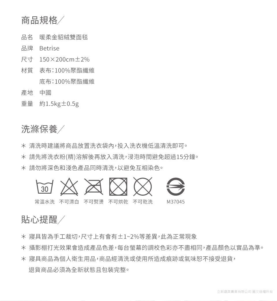 ◆內容:金貂絨雙面毯 × 1◆材質:表布 -100%聚酯纖維(金貂絨面)◆底布 -100%聚酯纖維(羊羔絨面)