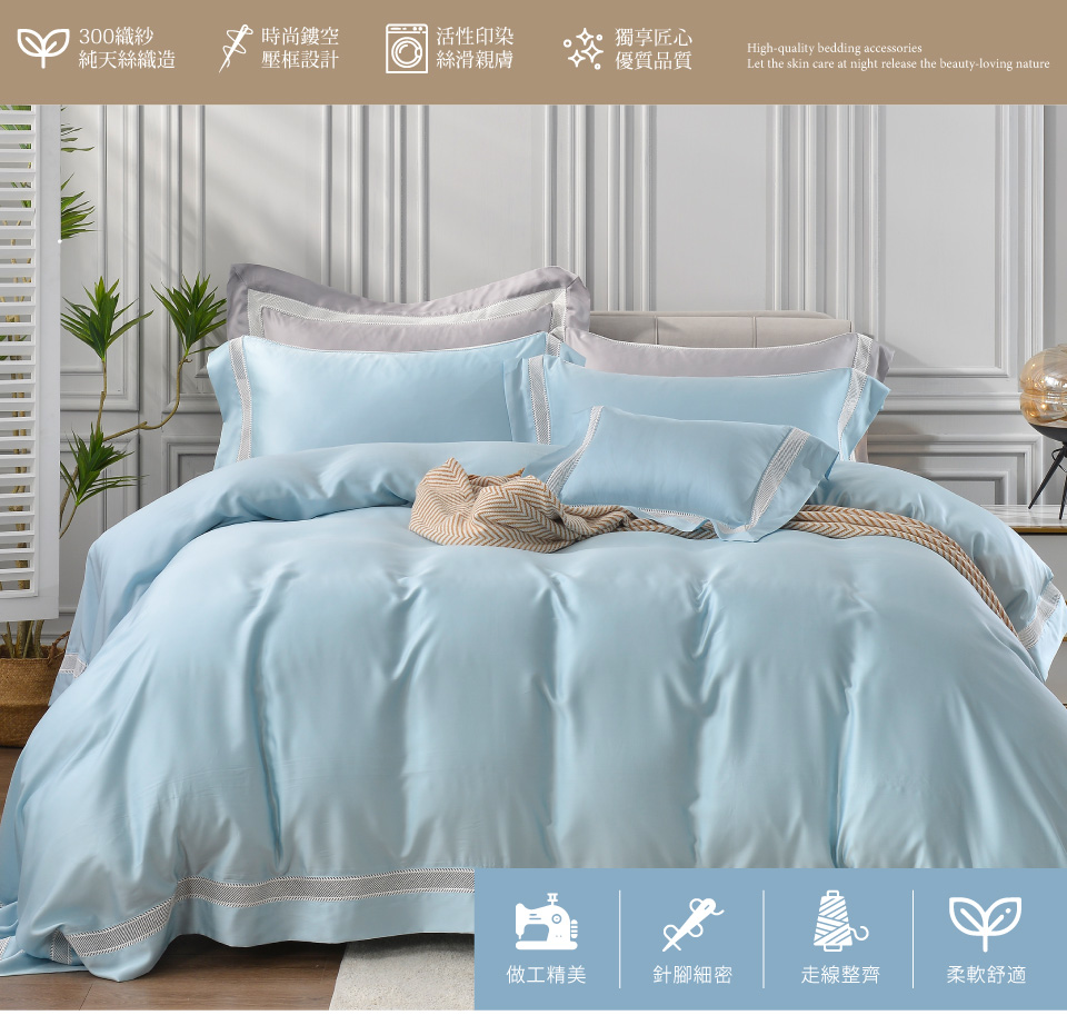 ◆因本商品屬高單價寢具,收到商品後請確認尺寸及商品狀況無誤後再使用~◆商品組合:全包覆式薄床包x1+壓框薄被套x1+壓框薄枕套x2+壓框抱枕套x1;共5件∕組◆產品內容∕材質∕清潔方式:◆全包覆式薄床包x1-雙人5x6.2尺(152x188公分)∕可包覆床墊高度:35±1公分◆壓框薄被套x1-6x7尺(182x212公分)(裝飾壓框約8公分±1公分)◆壓框薄枕套x2―48x75公分(裝飾壓框約8公分±1公分)◆壓框抱枕套x1(不含枕芯)―30x45公分(裝飾壓框約8公分±1公分).材質―表布/底布:100%萊賽爾纖維天絲(經緯紗60/60).顏色-如產品圖示,網頁圖片因拍攝關係,與實品略有差異,實際顏色以出貨為主.產地-中國(台商監製)◆清潔保養方式:可水洗/不可烘乾/不可漂白/勿使用強力漂白清潔劑/浸泡時間請勿超過20分鐘/建議可放入大型洗衣袋後再清洗(因深色布料請勿使用含漂白劑之洗劑,盡量避免浸泡,深淺色寢具請分開清洗) 請使用寢具專用洗衣袋清洗◆注意事項:.注意事項一:商品如經拆封、使用過、清洗過或拆解以致缺乏完整性及失去再販售價值時,恕不接受退換貨!.注意事項二:此商品圖為參考用之情境圖示,產品內容以規格敘述內容為準.注意事項三:商品若欲辦理退款依法需先恢復商品原狀,否則需支付恢復商品原狀之費用方得辦理退款。(新品瑕疵除外)。.注意事項四:商品退換貨,需有外包裝破壞袋包覆,如商品提袋包裝汙損將無法退換貨,需另補償整新費。.注意事項五:為了保障雙方權益,請在拆封過程中務必全程錄影,以確保商品是否遺漏、缺貨、瑕疵品(商品缺件、汙漬)等,包裹/商品有問題請於7天商品鑑賞期內,附上完整錄影檔為依據告知,逾期恕不予受理!.注意事項六:請勿以粗糙之衣物(如竹蓆、釘釦..等)或身體皮膚粗糙部位直接磨擦布面,以免造成布面起毛球/繡線脫落之狀況,刺繡款有尾線頭,為正常現象,請勿剪除。.注意事項七:送達地點有否限制:限台灣本島地區,外島恕不接單