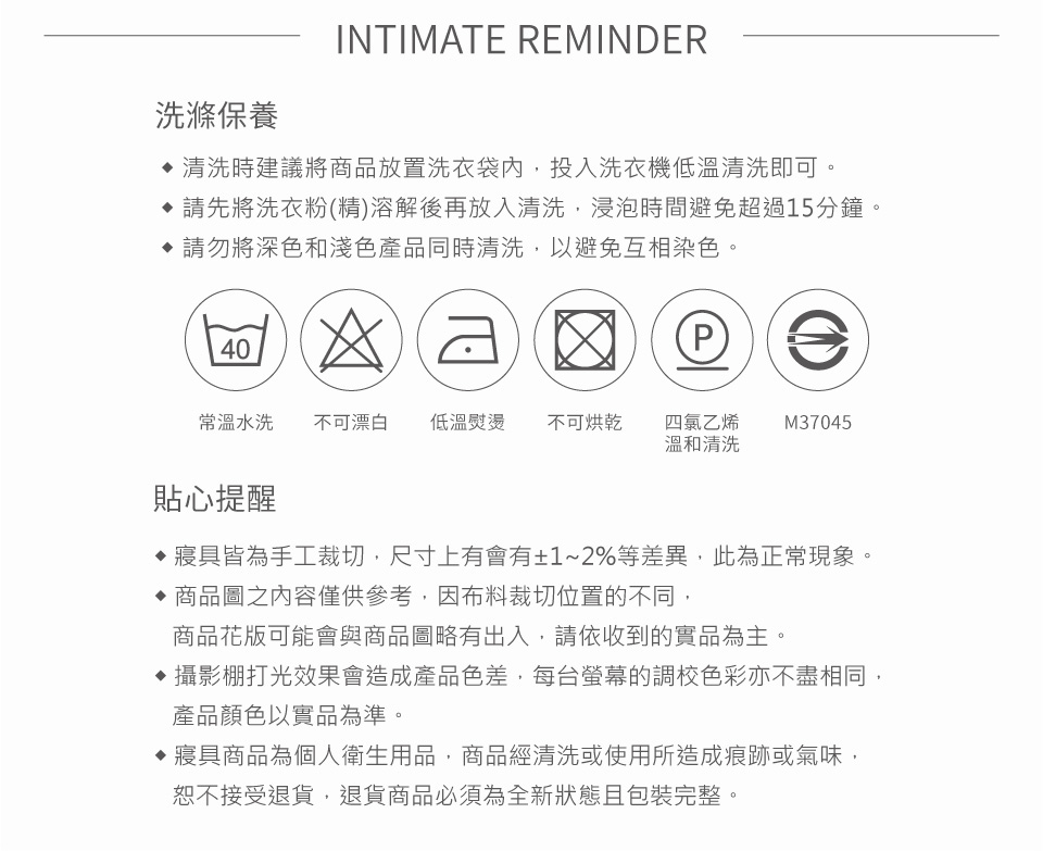 ◆清潔保養方式: 可水洗/不可烘乾/不可漂白/勿使用強力漂白清潔劑/浸泡時間請勿超過20分鐘/建議可單獨放入大型洗衣袋後再清洗