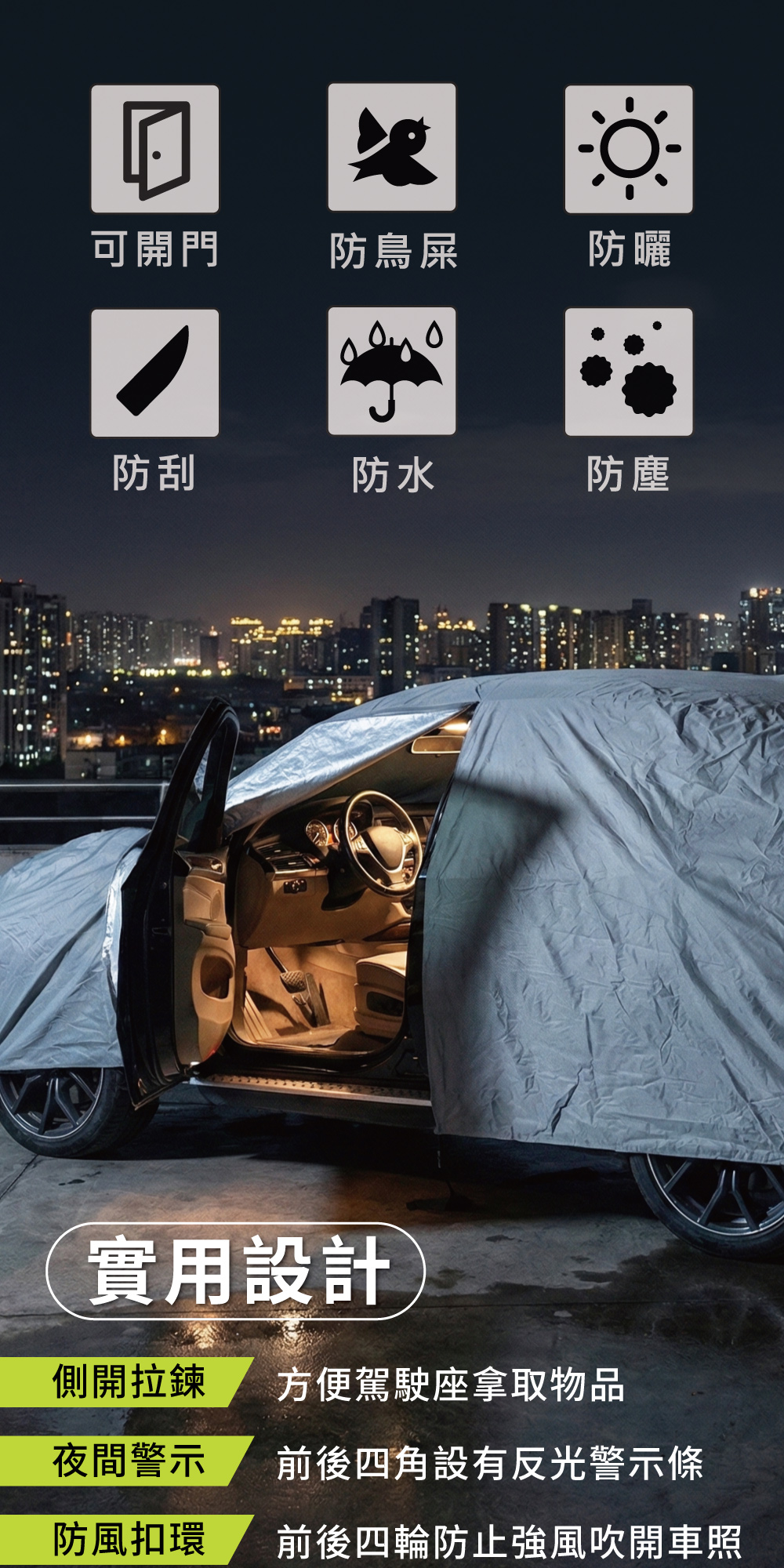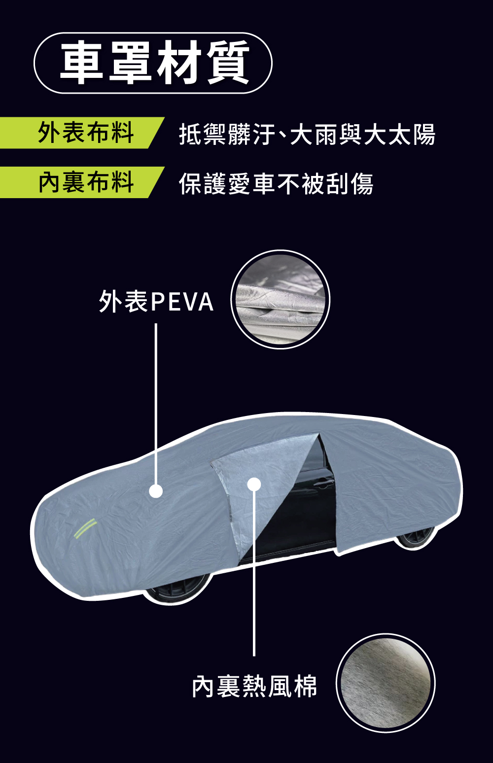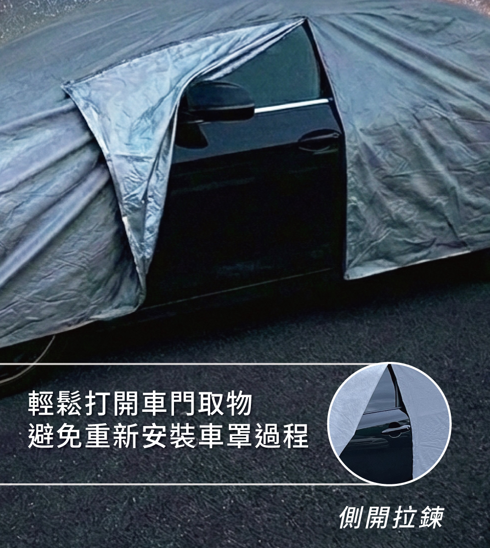 BOSITE 旗艦級全效保護車罩,專為對抗惡劣天氣與環境損害而生,提供愛車最耐用的防護屏障。‧ 貼心的駕駛座側開拉鍊設計,讓您不需拆卸車罩即可隨時開啟車門取物。‧ 提供防水、防塵、防曬、防刮與防鳥屎侵蝕,全方位守護漆面潔淨。‧ 外層採用強化 PVC 材質,具備優異的抗拉扯韌性,比普通 PEVA 更能對抗強風。‧ 內裡使用高密度針刺棉,質地柔軟不刮傷車漆,並顯著提升隔熱降溫效果。‧ 配備四輪專用扣環與底盤防風扣,五點式加固設計能有效防止車罩被強風吹飛。‧ 車身前後四角均設有高亮度反光警示條,大幅提升夜間停放的可視性與安全性。